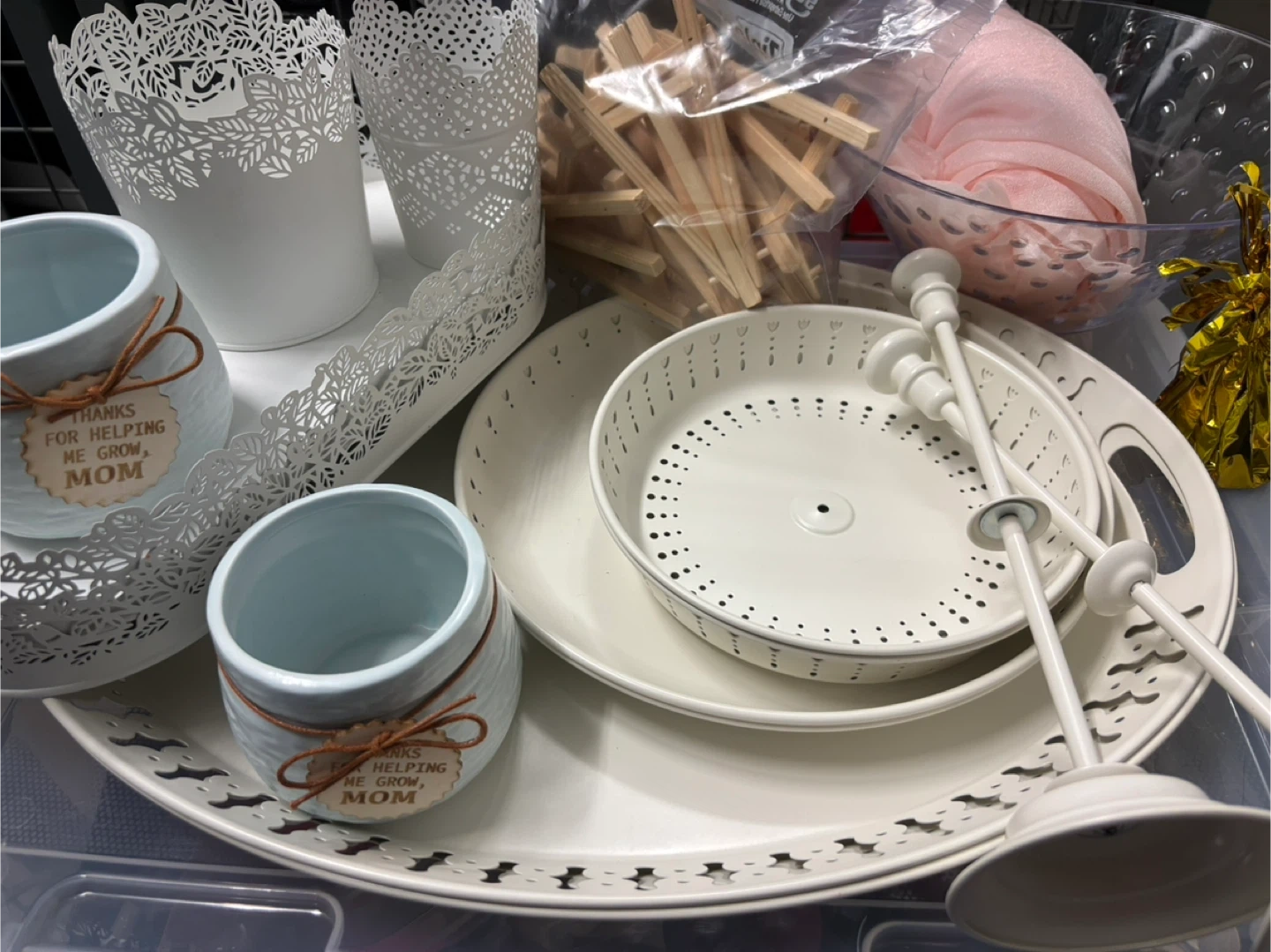 2 Tiered IKEA Garnera serving stands 2 Romantisk IKEA serving trays 1 Samverka IKEA small plant pot (I’ve used for raffle tickets at showers) 2 Samverka IKEA trays 1 Skurar IKEA tealight holder (I’ve used as a pen holder at events) 1 plastic salad bowl 2 small blue plant pots (I’ve used for utensils at baby showers) Happy to include 12 mini easels for signs and random shower game assortment Small scratches on some of the pieces, but look great at a party or event still