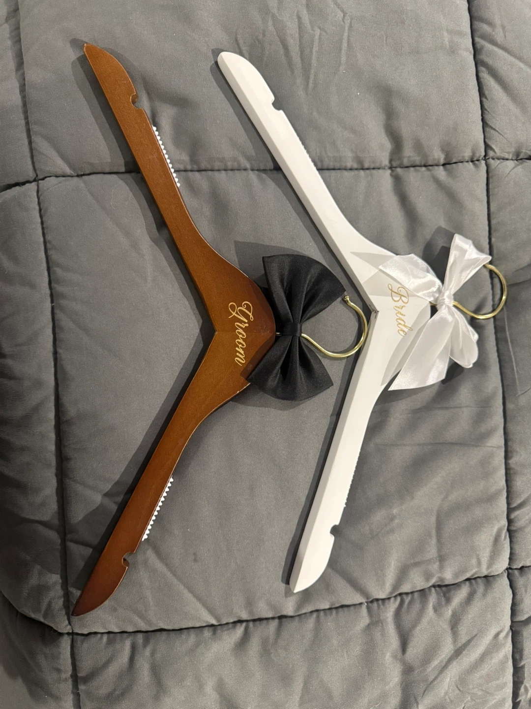 Selling a set of wooden hangers, one for the bride and one for the groom Perfect for wedding day photos or as a keepsake The bride's hanger is white with a white bow, and the groom's hanger is brown with a black bow