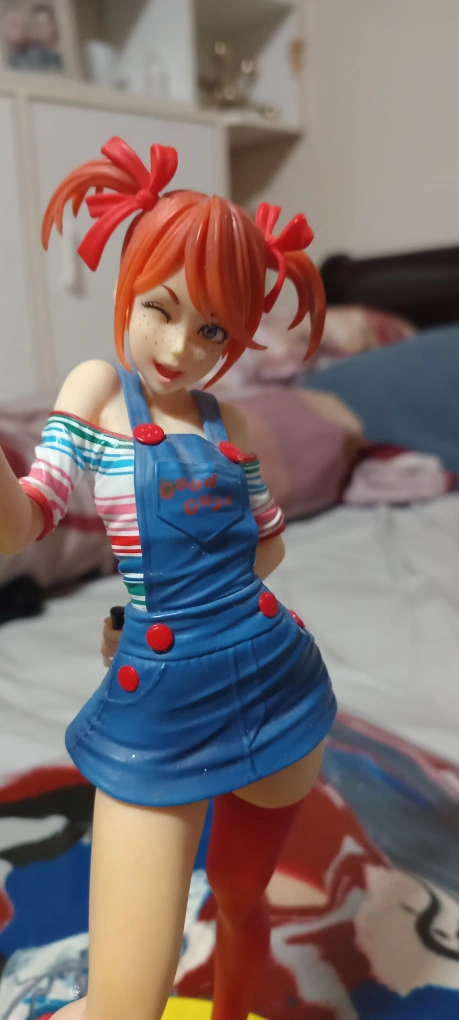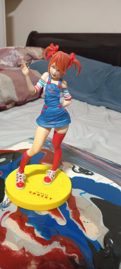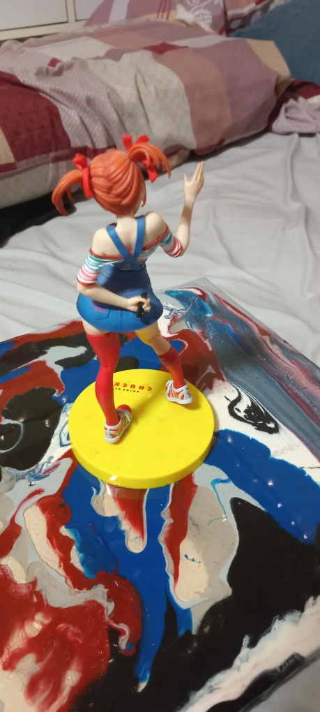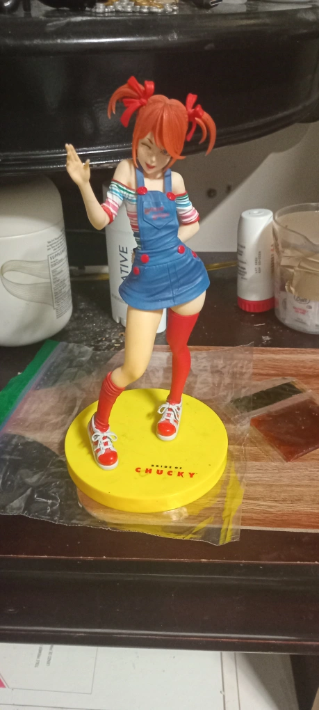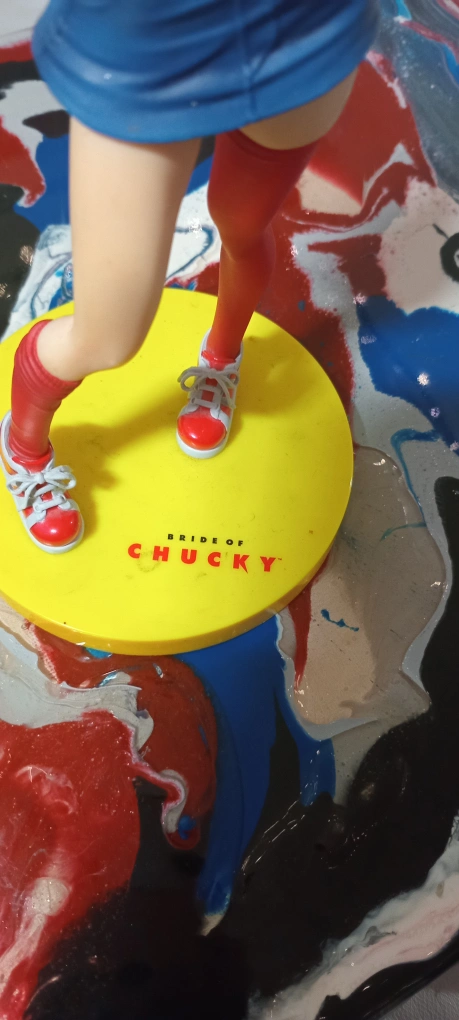 Selling a Bride of Chucky Tiffany Valentine anime figure. It's in great condition and ready for a new home! The figure features Tiffany in her iconic outfit from the movie, standing on a yellow base with the 'Bride of Chucky' logo. Perfect for any horror or anime collector!
