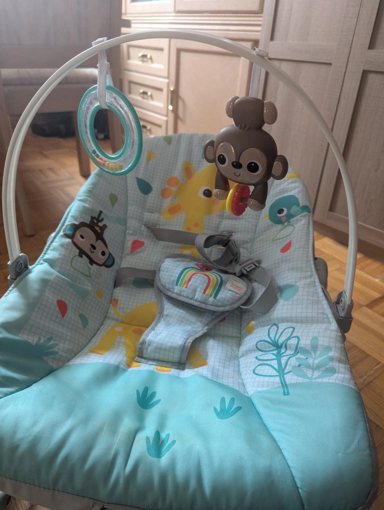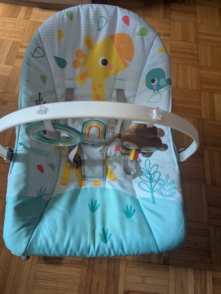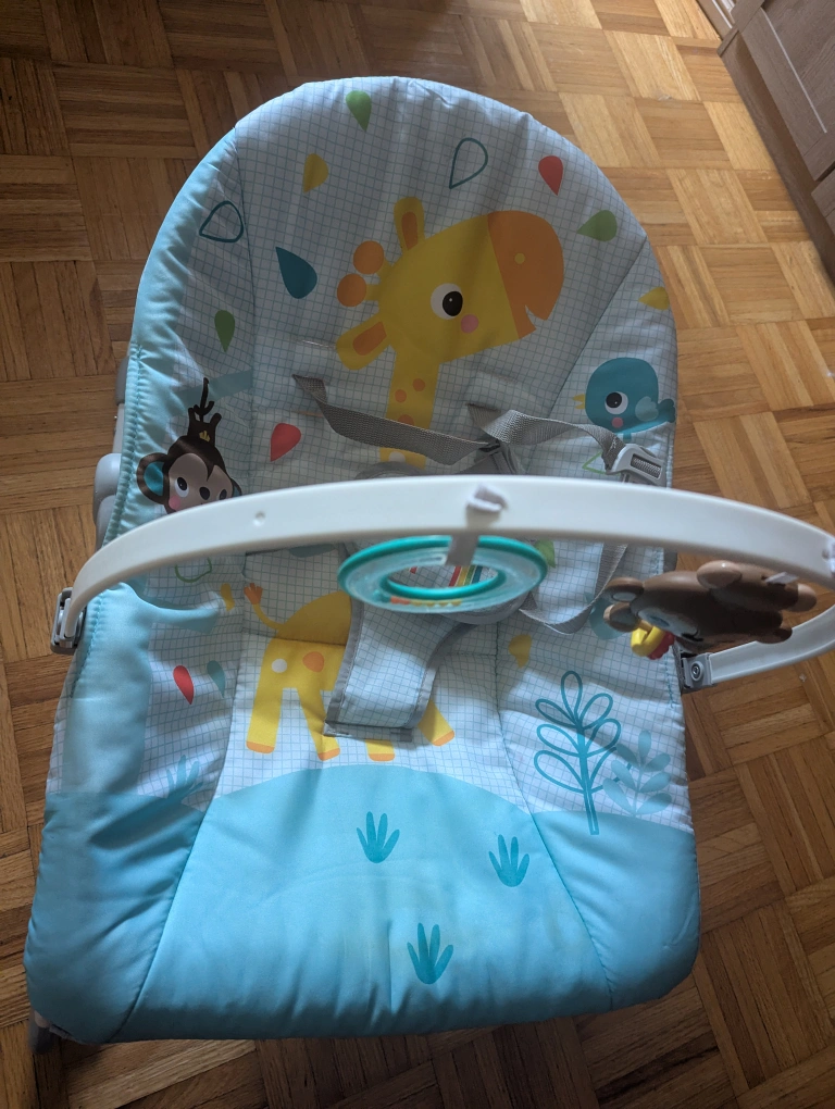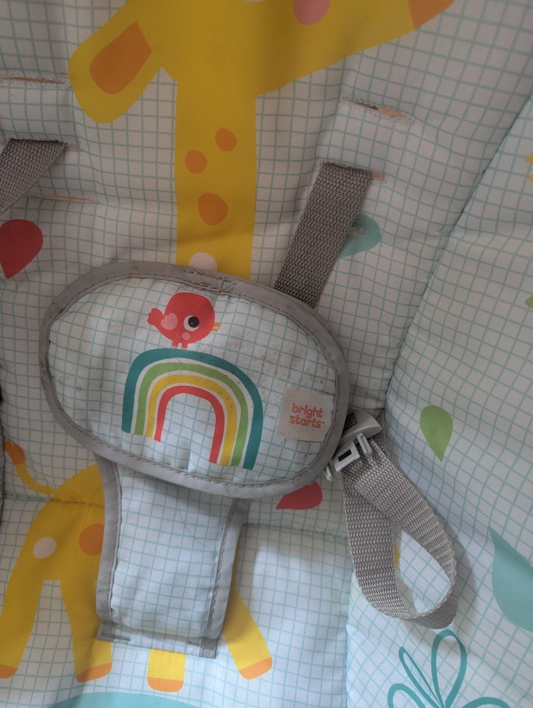 Selling a Bright Starts baby bouncer in excellent condition! It features a playful design with giraffes and other cute animals. The bouncer includes a toy bar with hanging toys to keep your little one entertained. Perfect for infants and young babies!