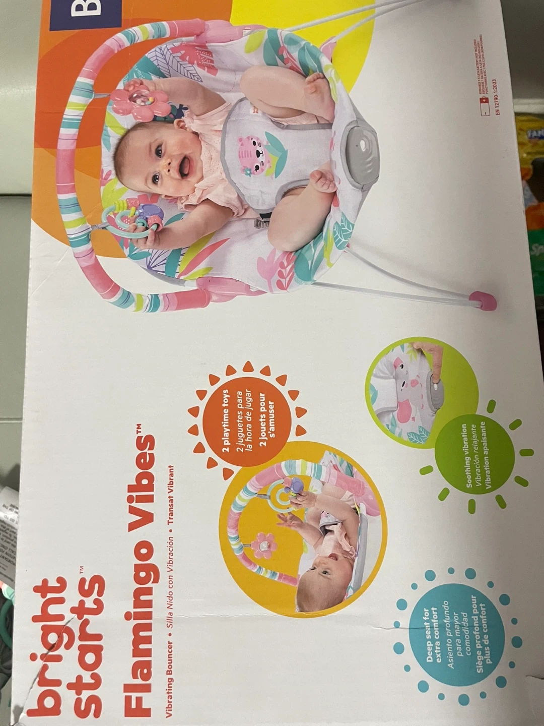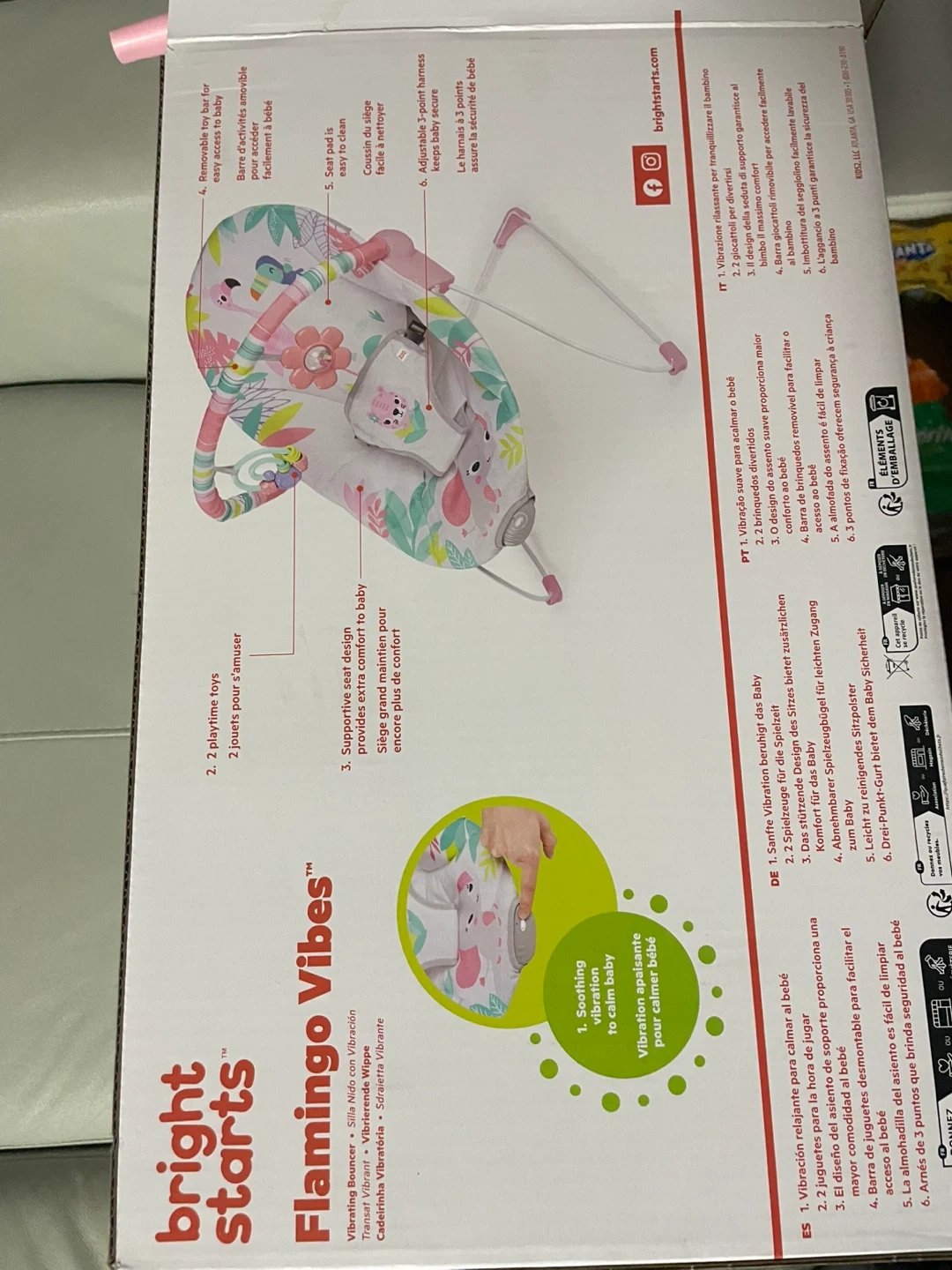 This Bright Starts Flamingo Vibes vibrating bouncer is perfect for soothing your little one! It features: - A removable toy bar with adjustable toys - A seat pad that's easy to clean - A supportive seat design for extra comfort - Soothing vibrations to calm baby It also comes with 2 playtime toys to amuse your baby