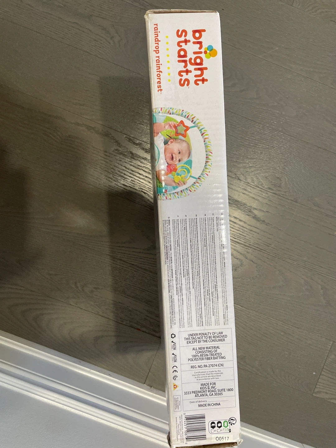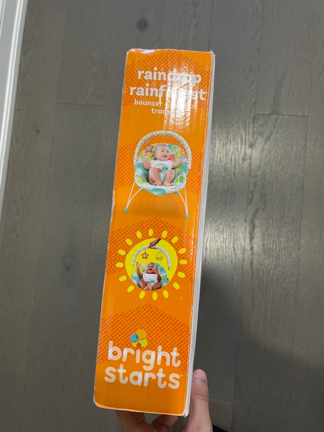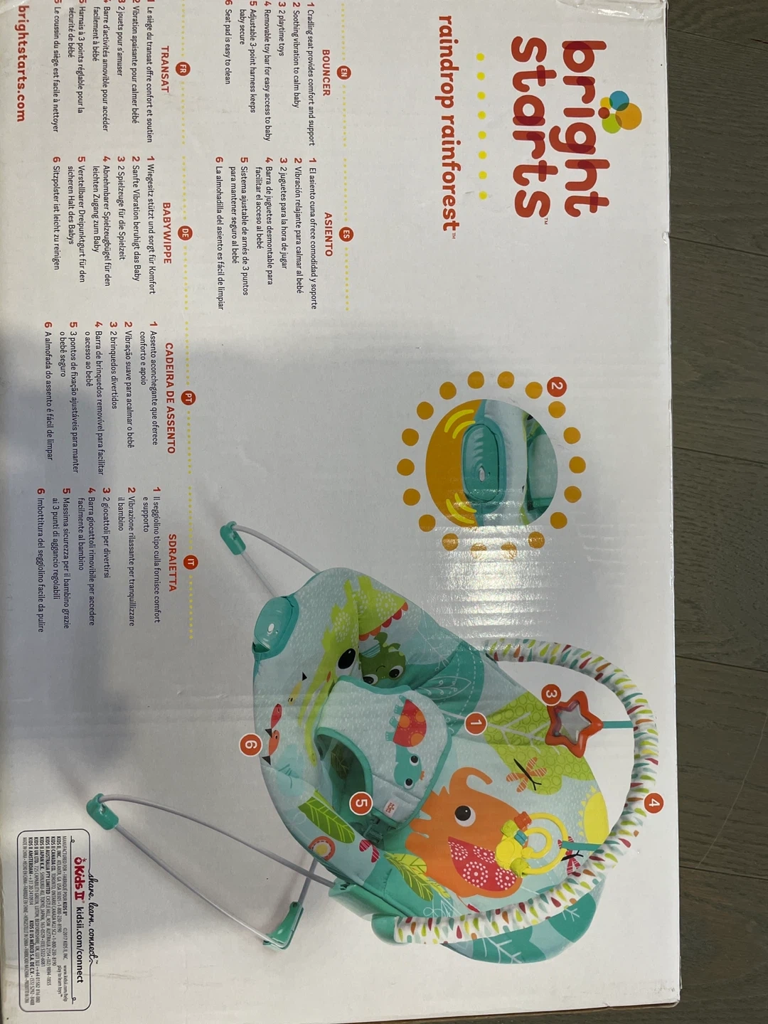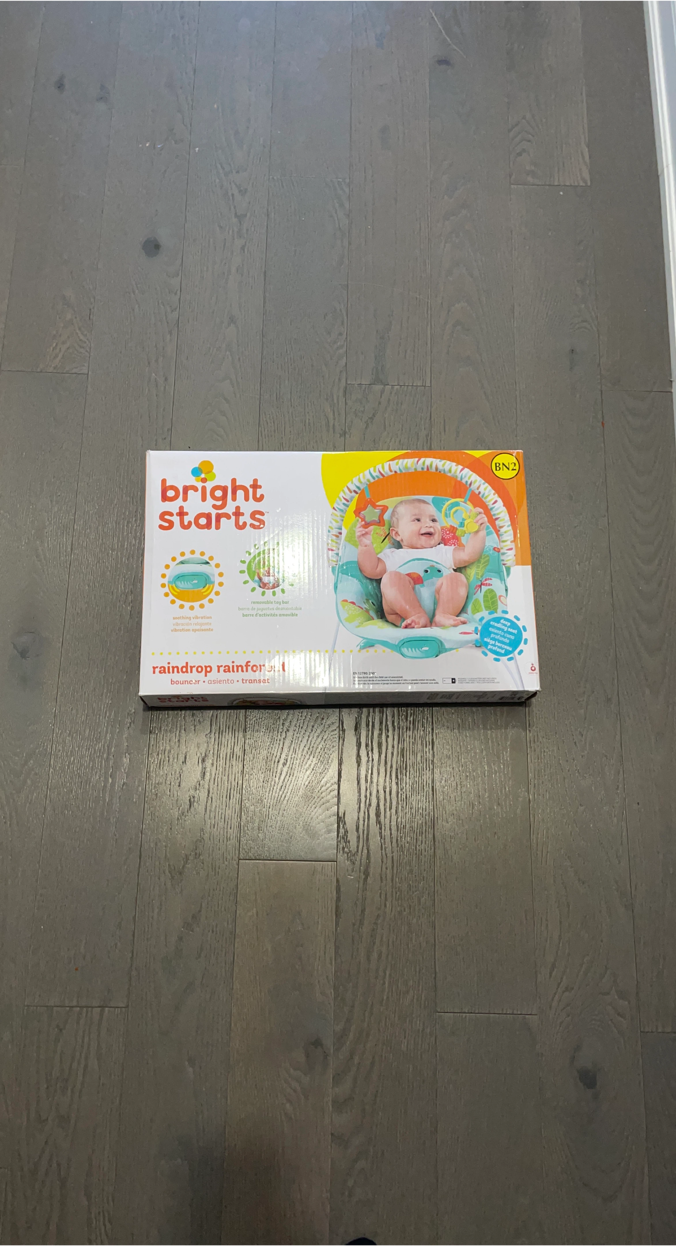 Selling a brand new Bright Starts Raindrop Rainforest Bouncer still in its original box! This cozy bouncer provides comfort and support for your little one. It features soothing vibrations to calm the baby and includes interactive toys to keep them entertained. Perfect for those early months! Box included