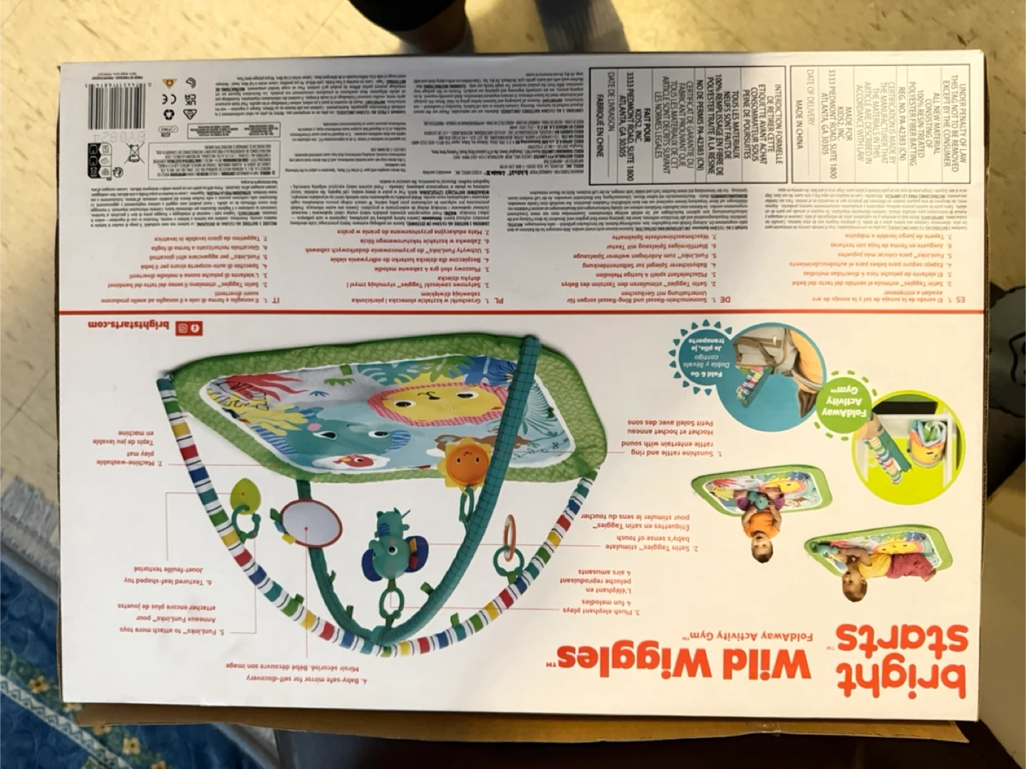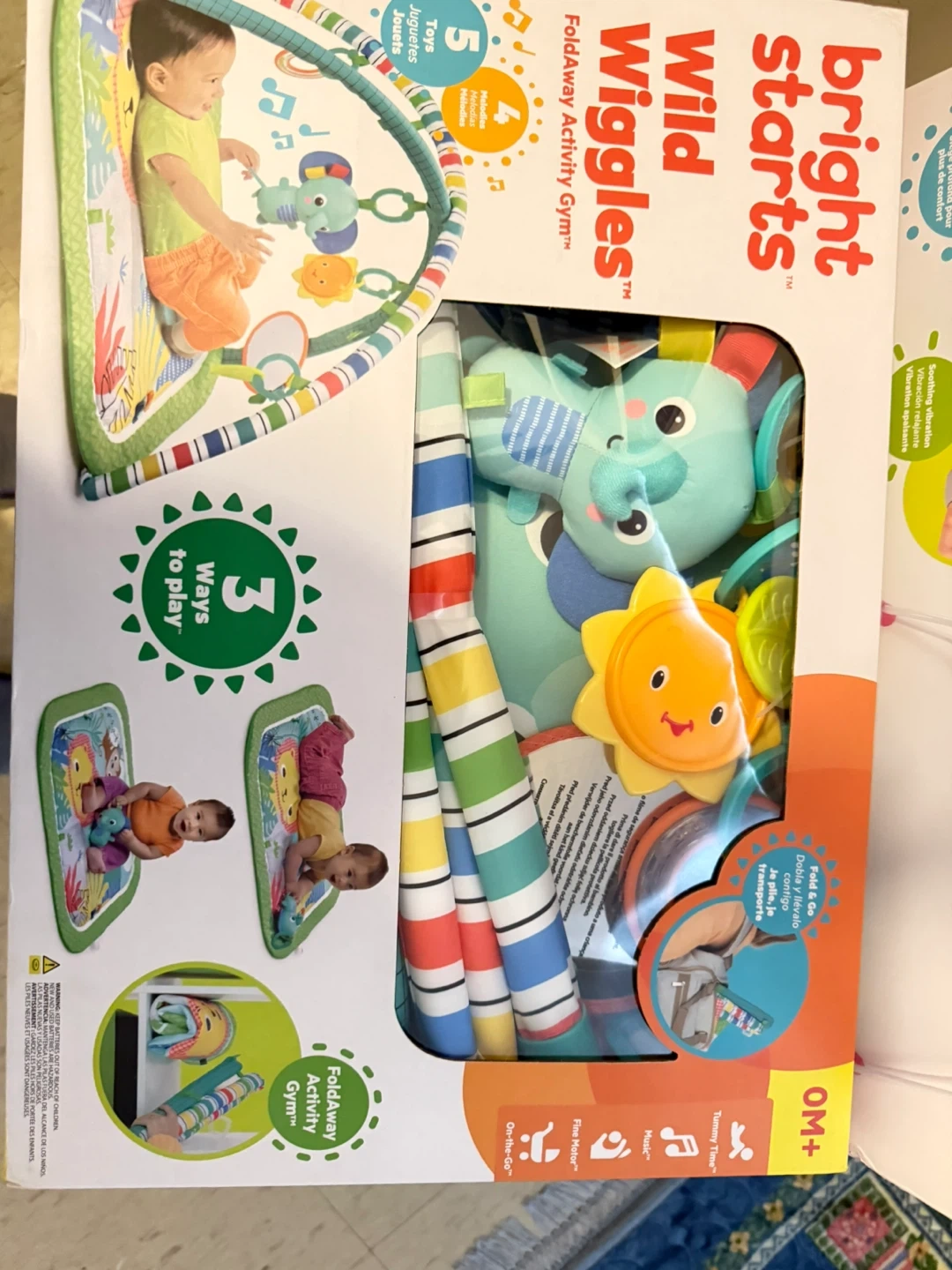 Bright Starts Wild Wiggles FoldAway Activity Gym – New in Box Keep your little one entertained with this fun and colorful activity gym from Bright Starts! Perfect for tummy time, playtime, and sensory development. ✨ Features: • 3 ways to play: tummy time, lay & play, and take-along fun • 5 engaging toys included (mirror, plush elephant, rattles, and more) • Plays 4 melodies to stimulate baby’s senses • Folds up easily for storage or travel • Suitable for newborns (0M+) and up 📦 Condition: Brand new in box, never used.