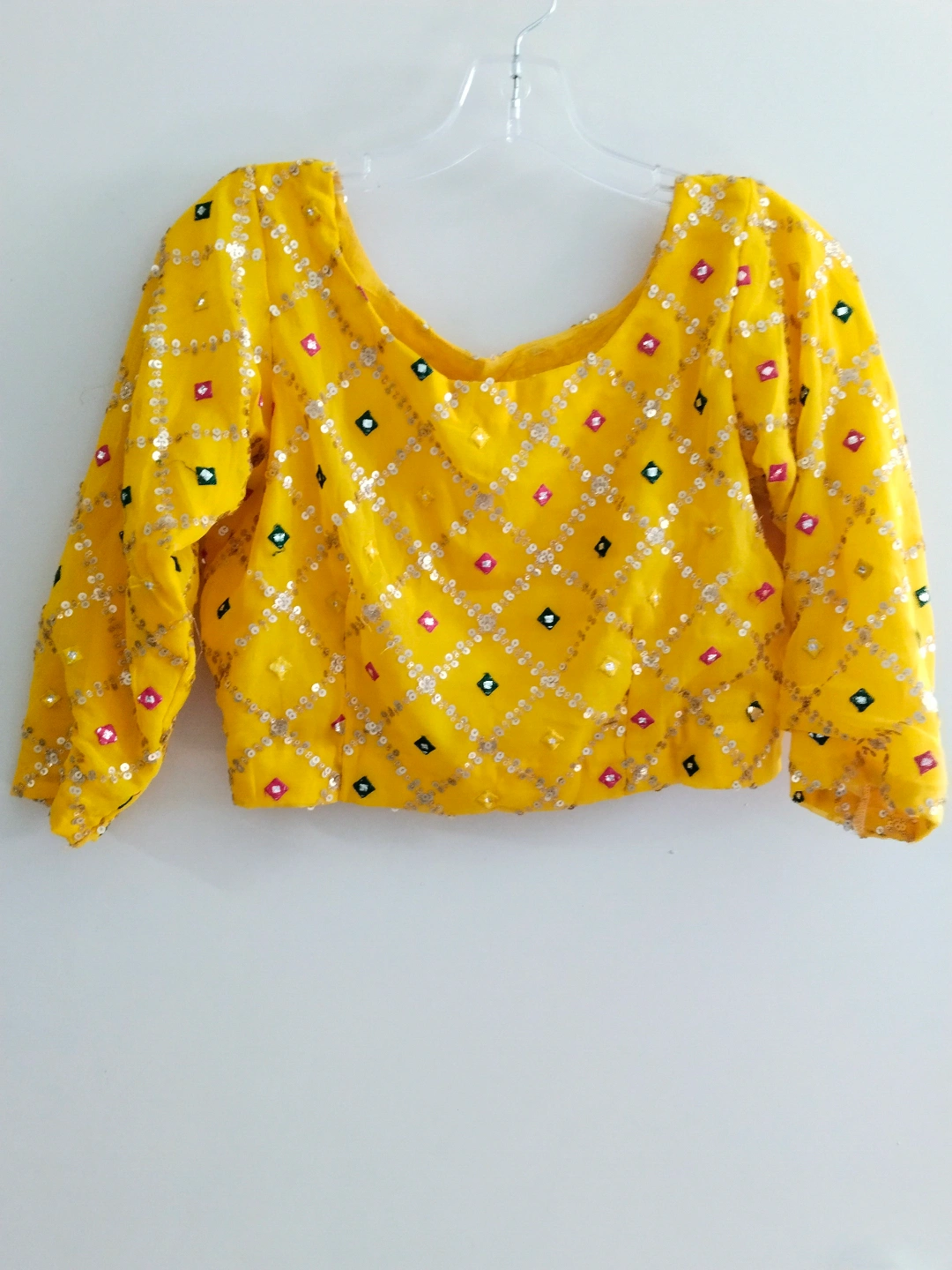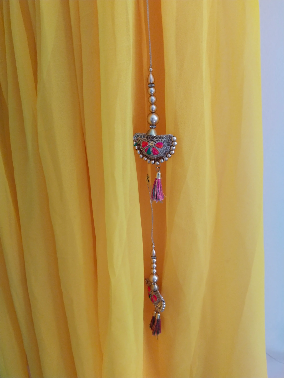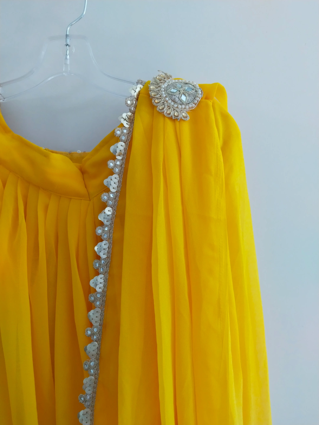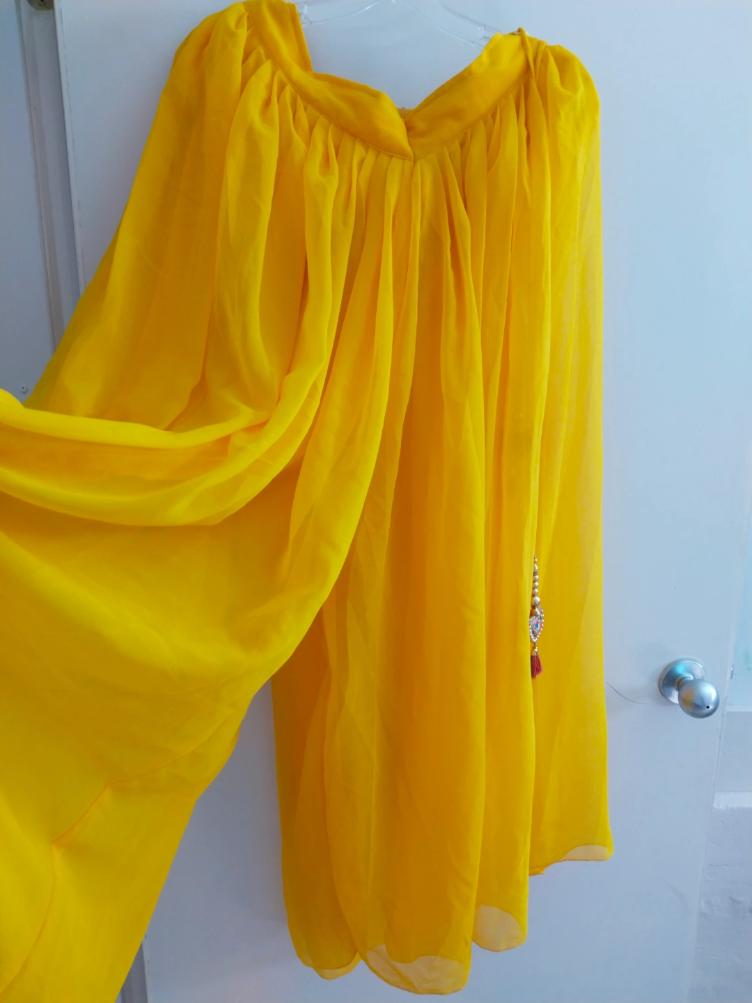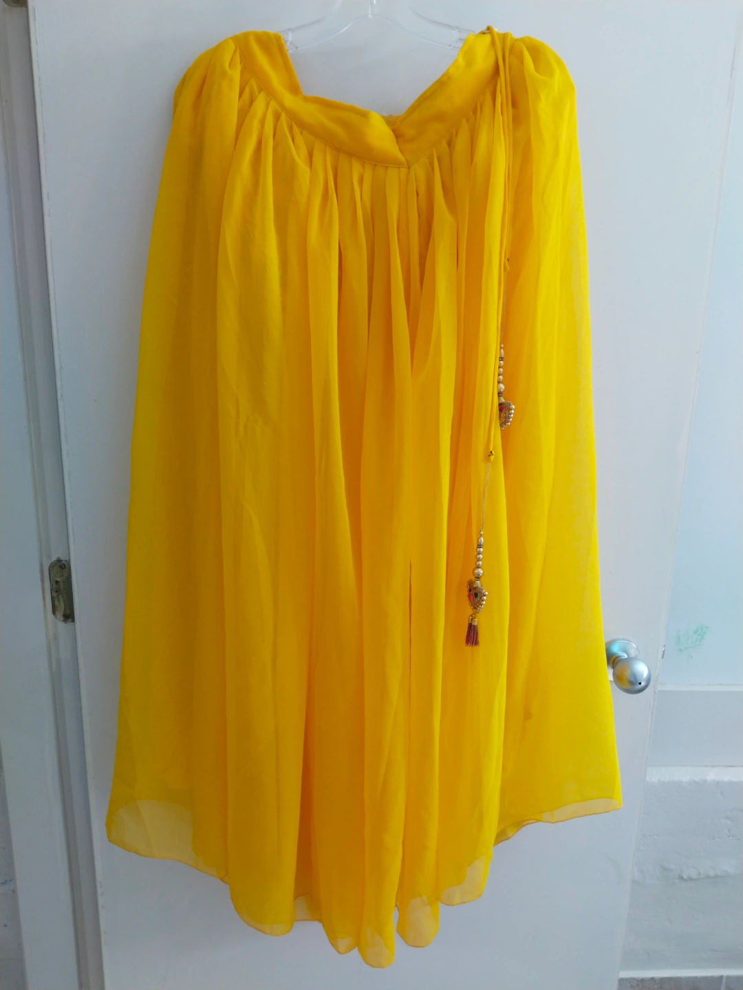 Yellow fabric, possibly chiffon. Decorated with silver details. Includes a matching top and dupatta. It is the perfect attire for a relaxing afternoon.