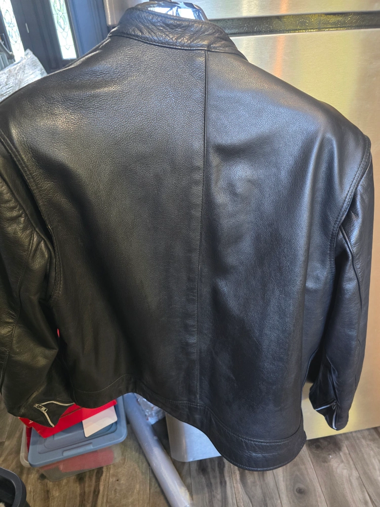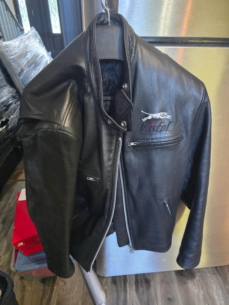 Selling a Bristol leather motorcycle jacket in black. The jacket features the Bristol logo on the front. It's in good condition and ready for a new owner!