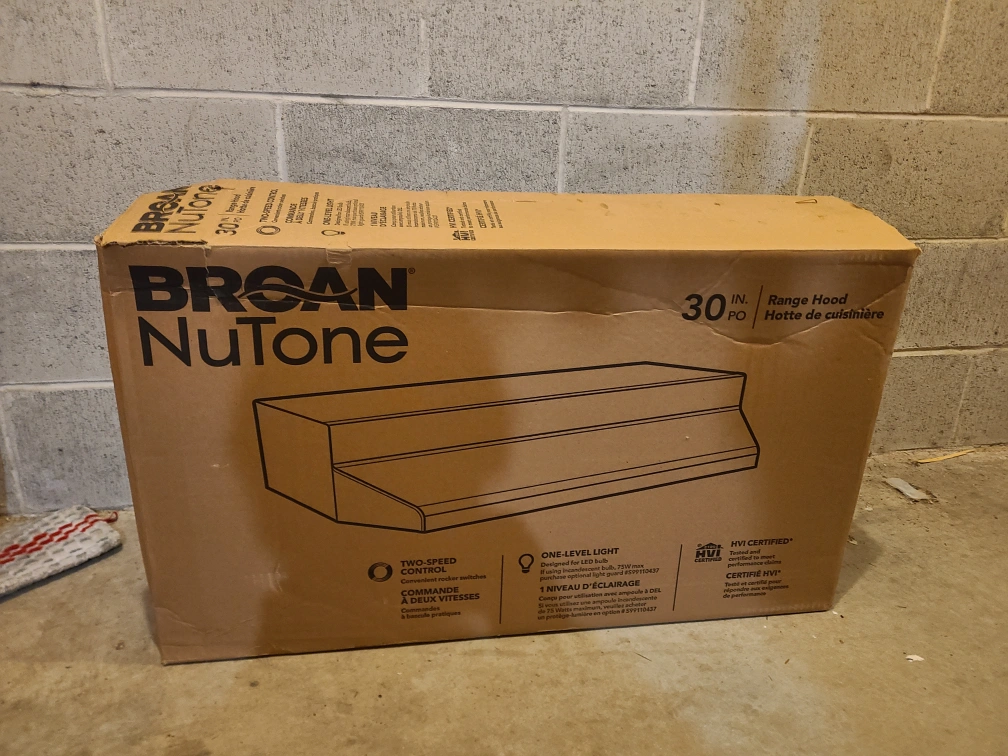 Selling a Broan NuTone 30-inch range hood. It features two-speed control and one-level light. The box is included! Great working condition. Given a good clean already. Strong motor. Top vented opening but can also do back vented if needed. Filter been thoroughly cleaned too.