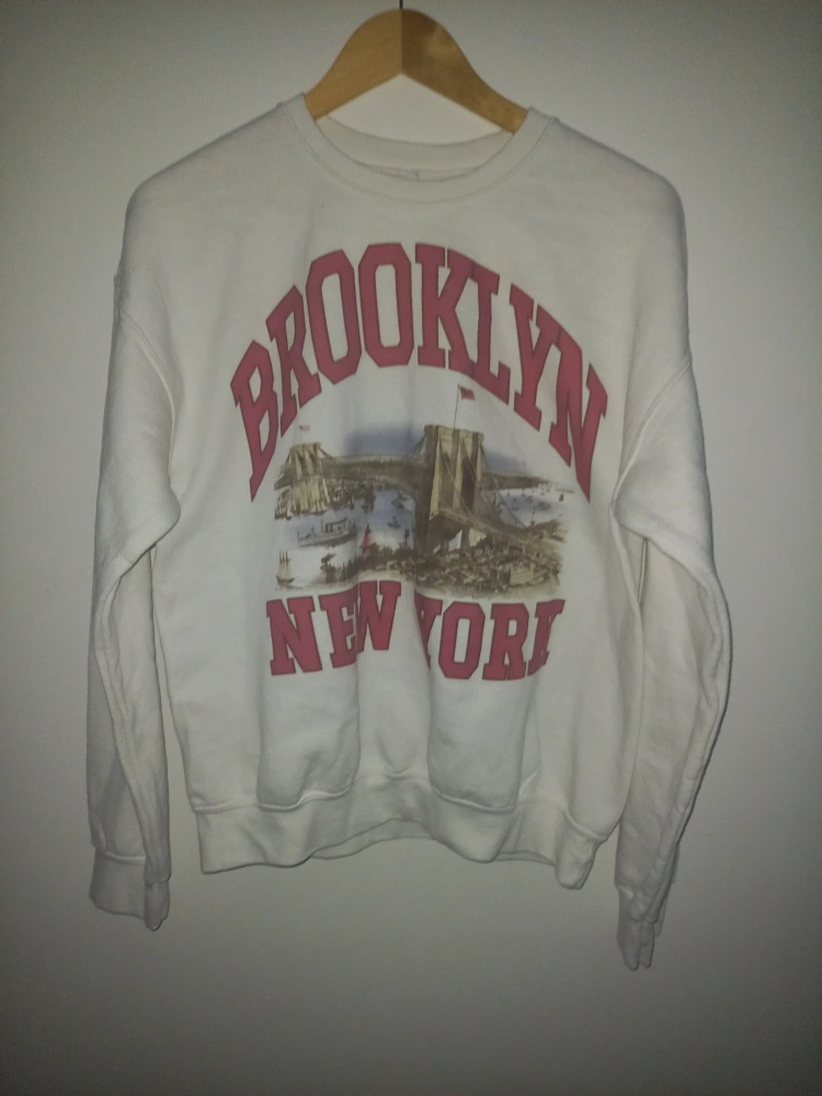 Cozy white sweatshirt featuring a "Brooklyn New York" design! Perfect for casual wear or layering up on chilly days. The design includes a print of the Brooklyn Bridge.