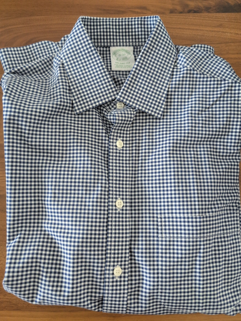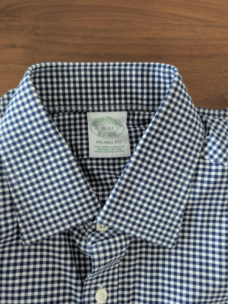 Here's a Brooks Brothers dress shirt in size 15-33. It features a blue and white gingham pattern. The shirt is a Milano fit, which is a slimmer cut. Made in Malaysia.