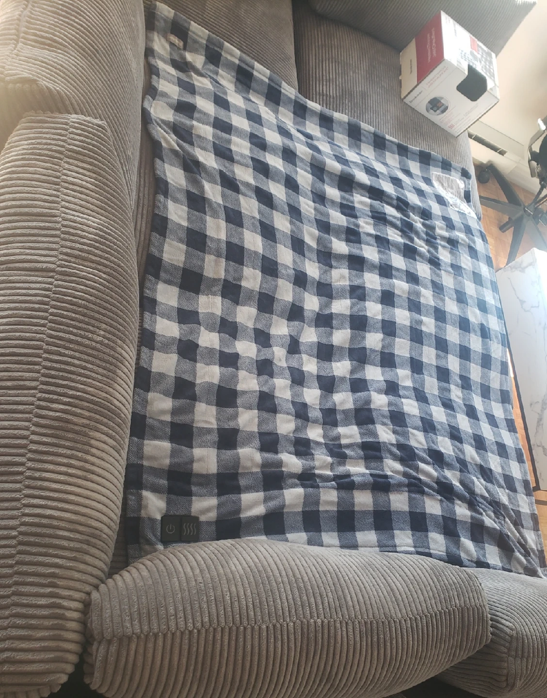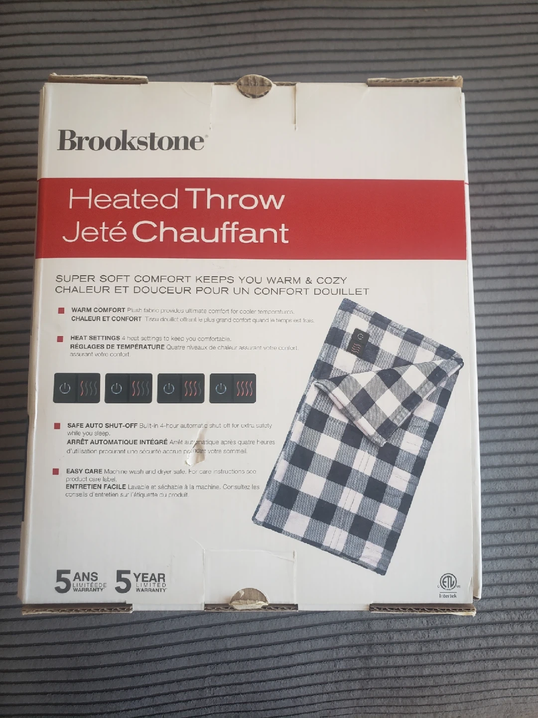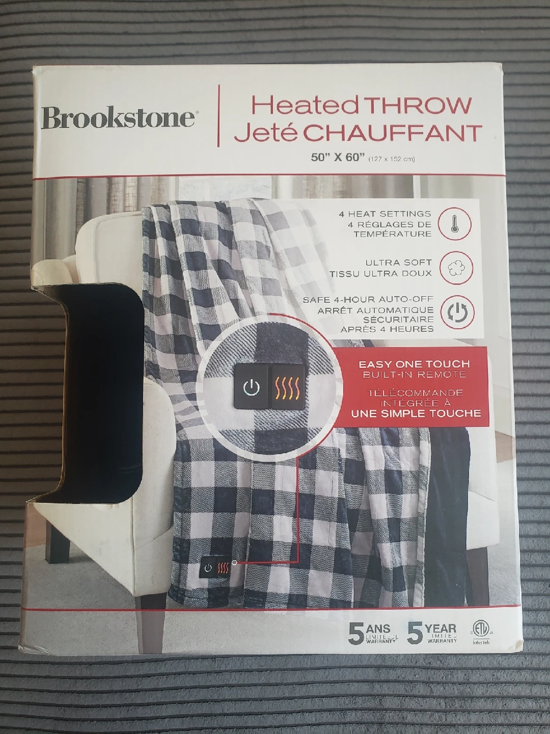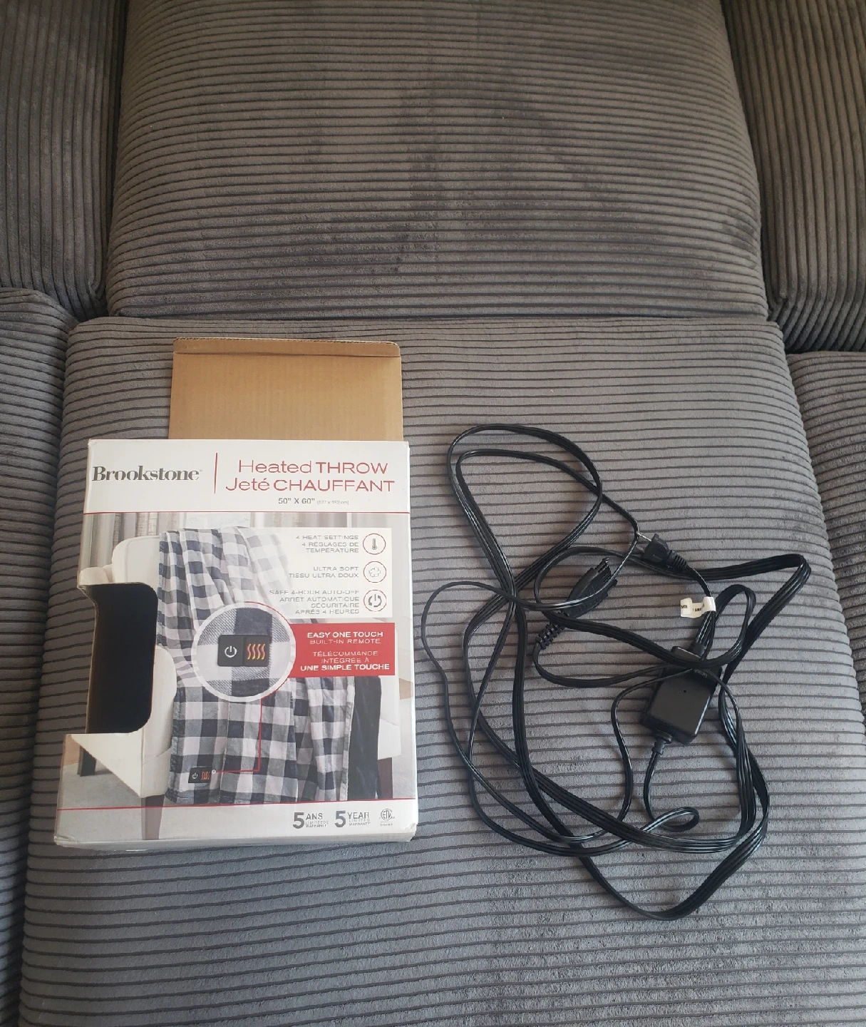 Stay warm and cozy with this Brookstone heated throw blanket! It's a super soft plush fabric, perfect for cooler temperatures. It has 4 heat settings to keep you comfortable and a safe auto-shutoff feature. The size is 50" x 60" (127 x 152 cm). Electrical cord is over 13 inches long for extra mobility. Never used, but was tested to be working. Comes with the box! Please follow washing instructions. Cash only payment