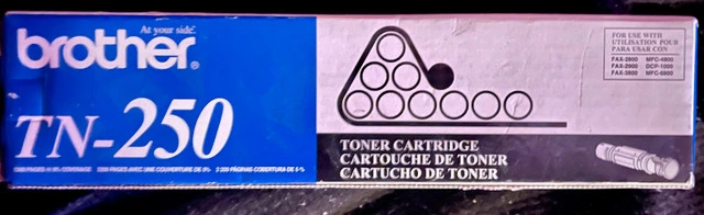 Brand new, sealed in box. Don’t need anymore. Open to reasonable offers as well. Check this link for what printers, scanners, and fax machines it fits: https://www.canadatoner.ca/Made-By-Brother-TN-250-TN250-Black-Laser-Toner-Cartridge-DCP-1000_p_10108.html