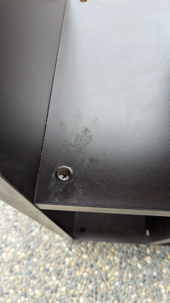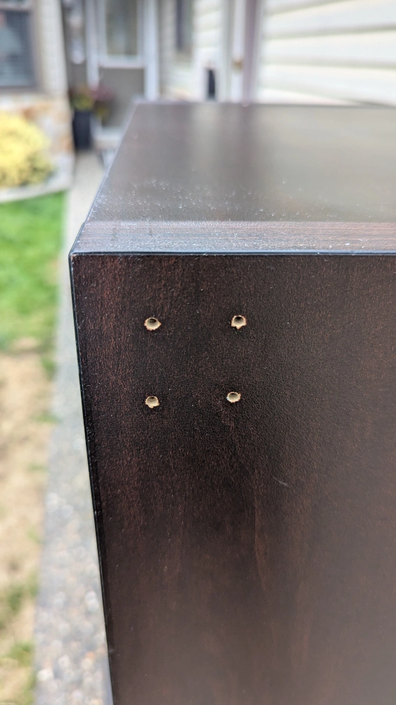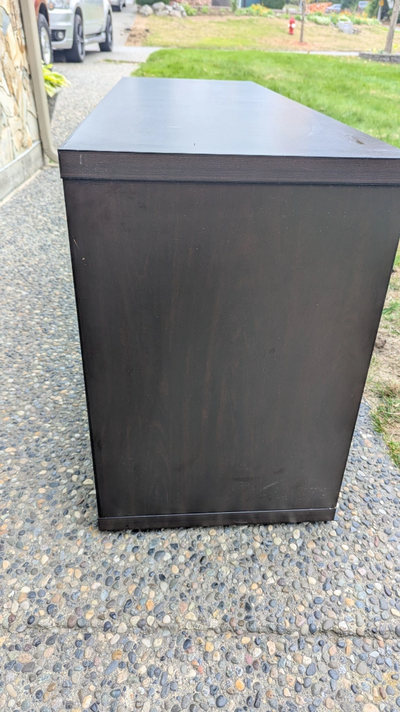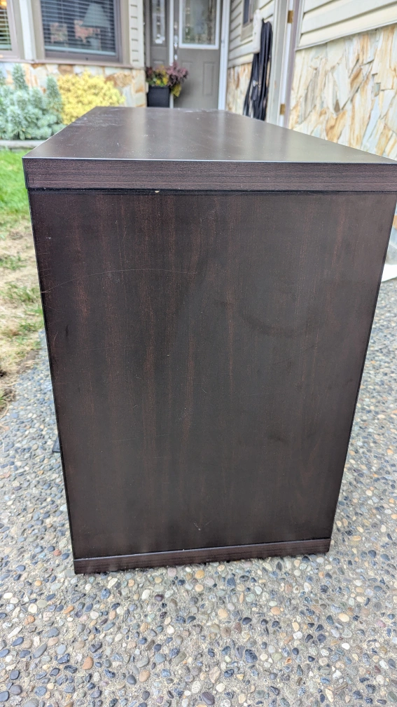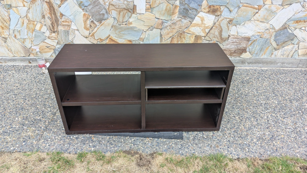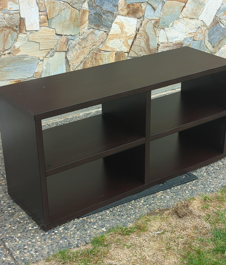 Selling a brown storage shelf with 4 cube compartments. It's in good condition and perfect for organizing your space. some slight some time ago on the back side. it has casters but was never installed. used as a media entertainment stand for some time. also has an optional shelf that is not fixed. both sides are finished, however the backside has some screw holes from mounting hardware