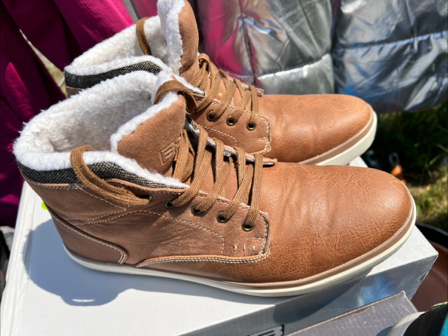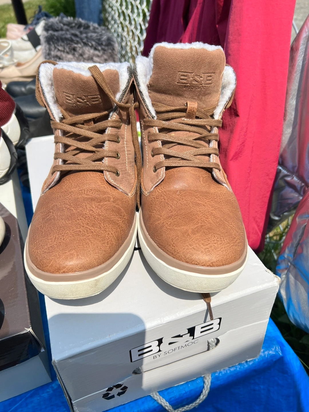 5Brown boots with a padded interior. Boots feature a lace-up design. Perfect for a leisurely stroll on a chilly day.