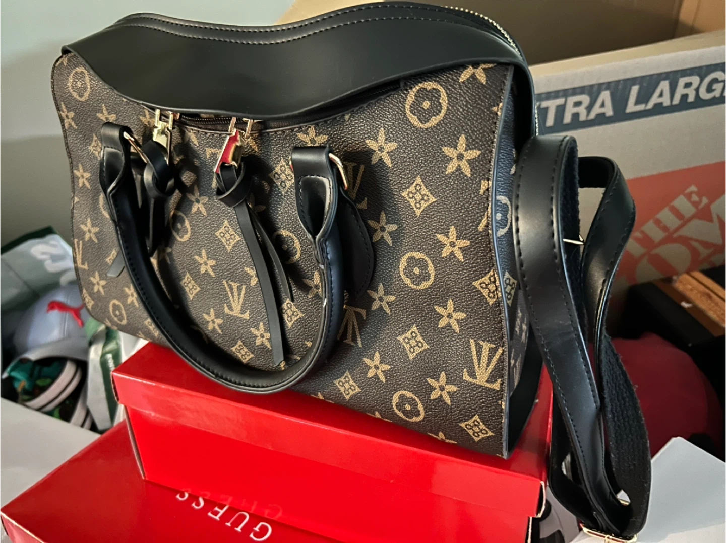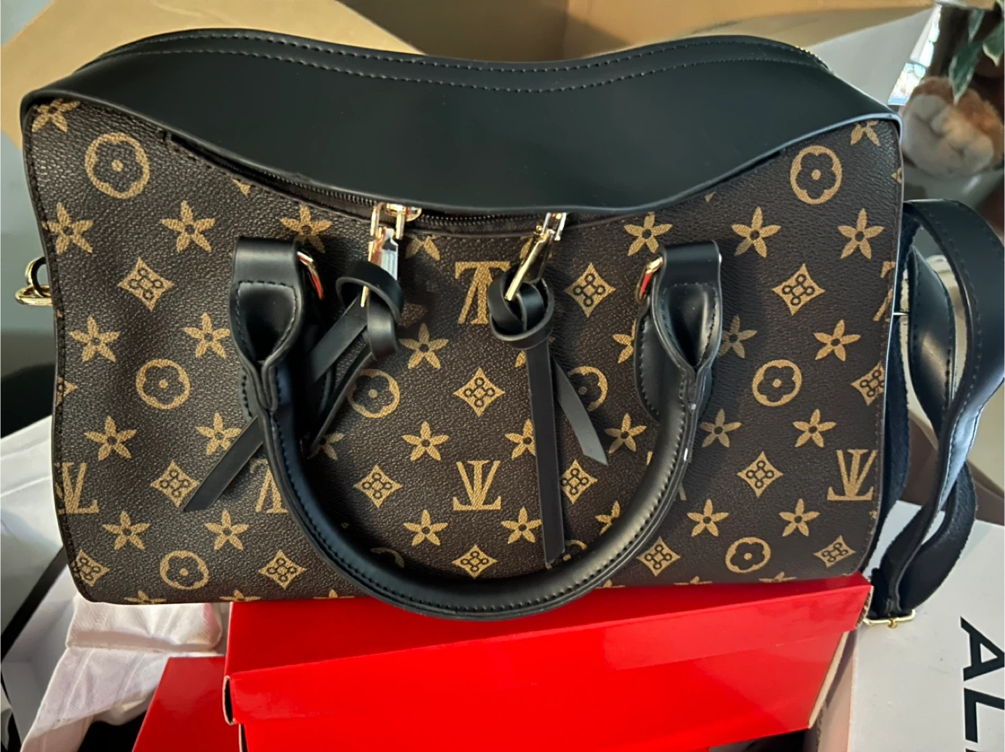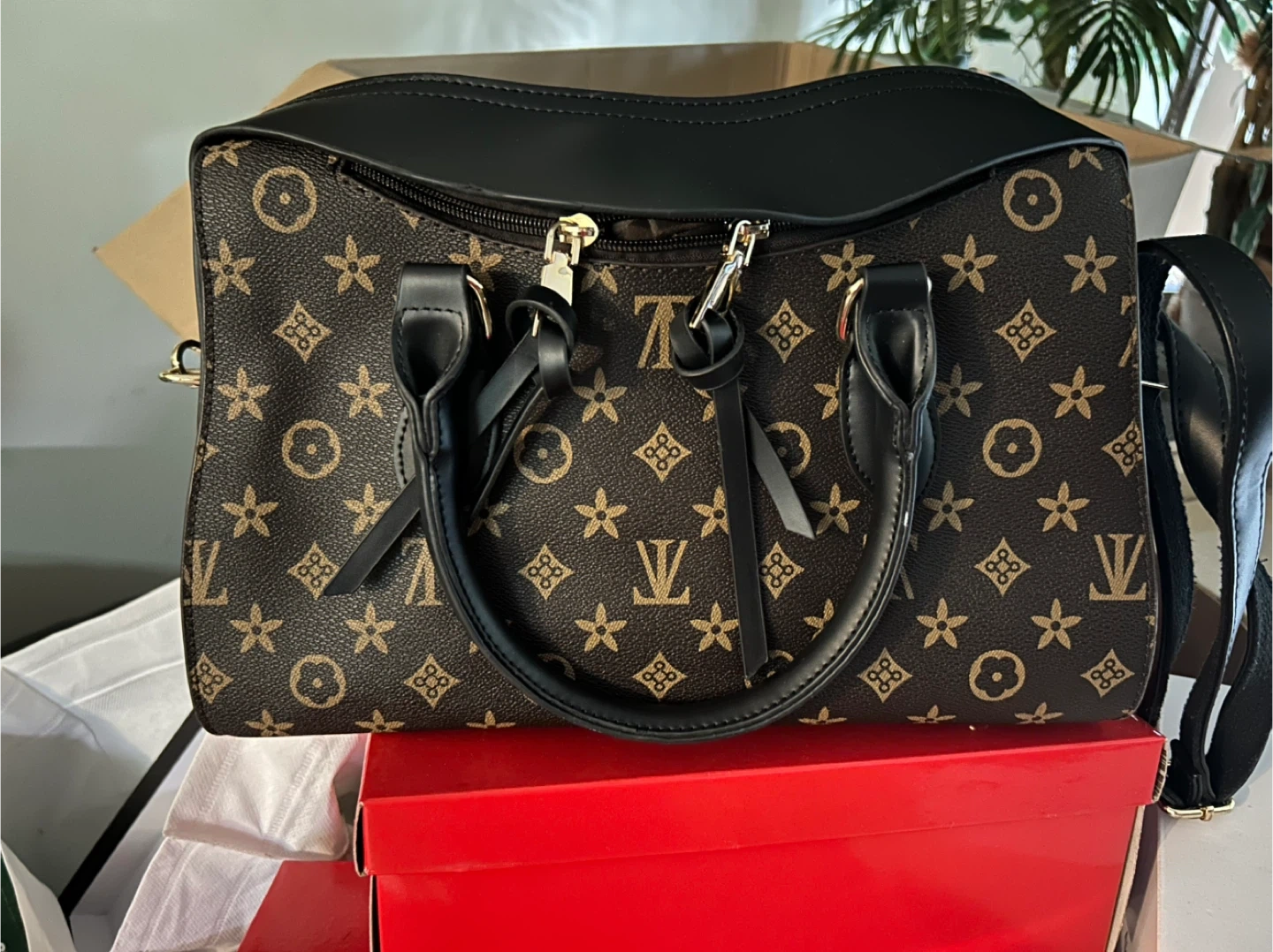 Selling a stylish handbag featuring a unique brown and black pattern. It's in great condition and perfect for everyday use! The bag has a comfortable handle and a detachable shoulder strap for versatile carrying options