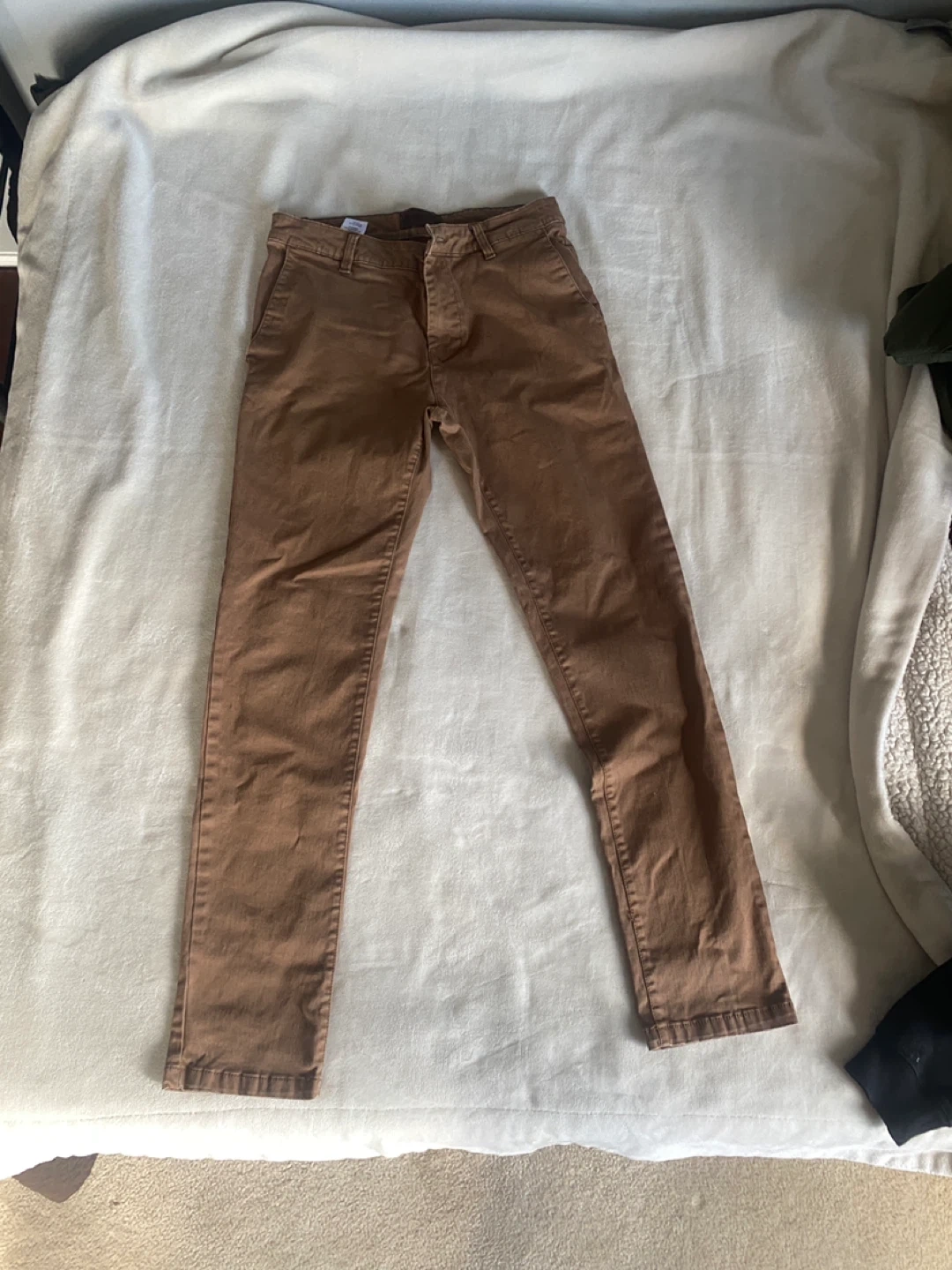 Selling a pair of chinos in a nice brown colour. They're in great shape and ready for a new home! Perfect for a casual day out or dressing up a bit