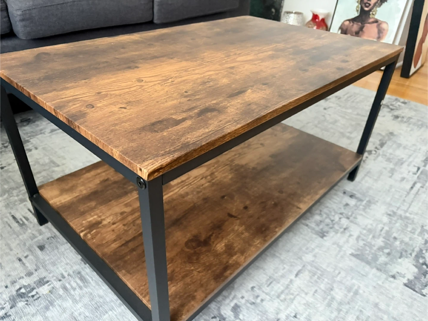 Selling a brown coffee table with a shelf. It's in great condition and would look great in any living room! The table has a sturdy metal frame and a wood-grain top and shelf. Perfect for storing books, magazines, or other items