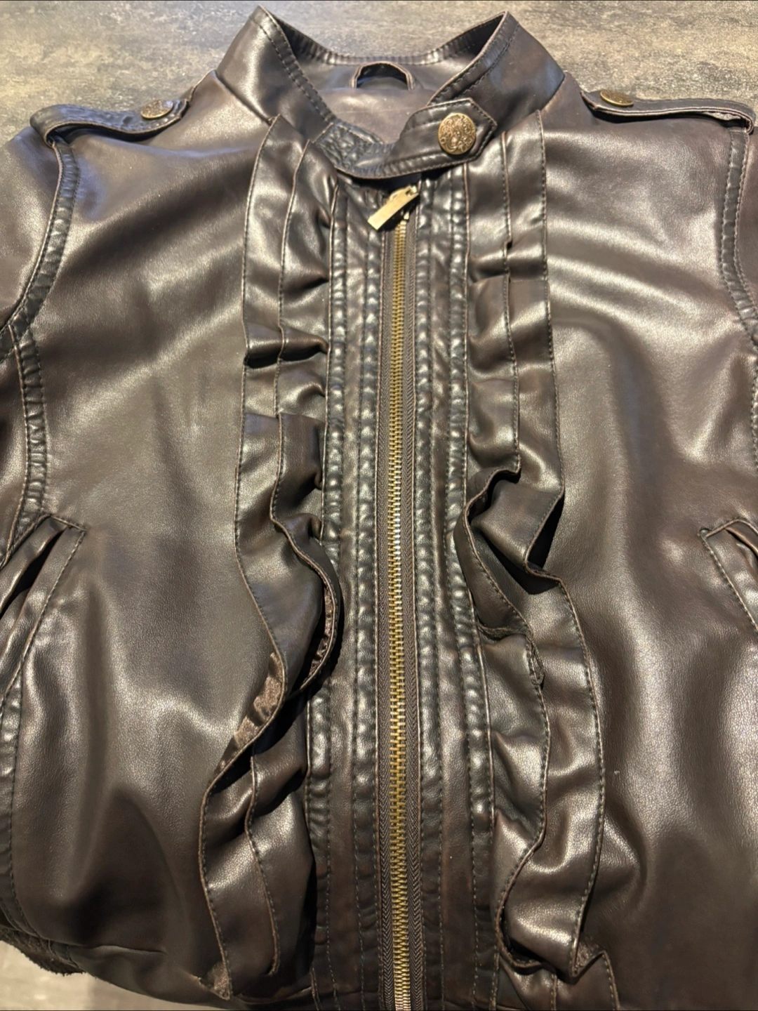 A stylish brown faux leather jacket in size M. It features a unique ruffled design down the front and has a zipper closure. It's made of 100% polyester.