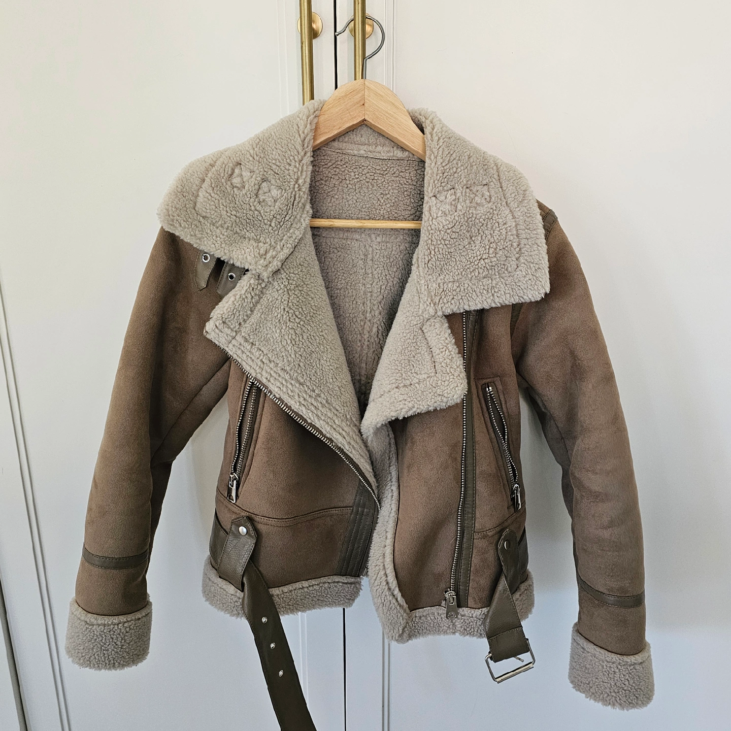 Selling a stylish brown aviator jacket. It features a faux suede exterior and a cozy faux shearling lining. Perfect for adding a touch of vintage flair to your wardrobe!