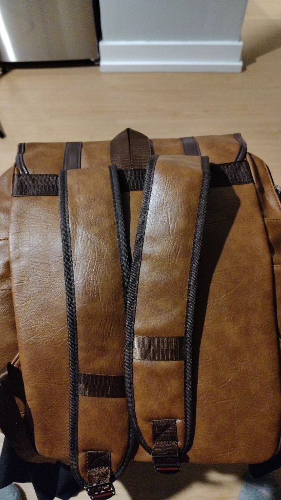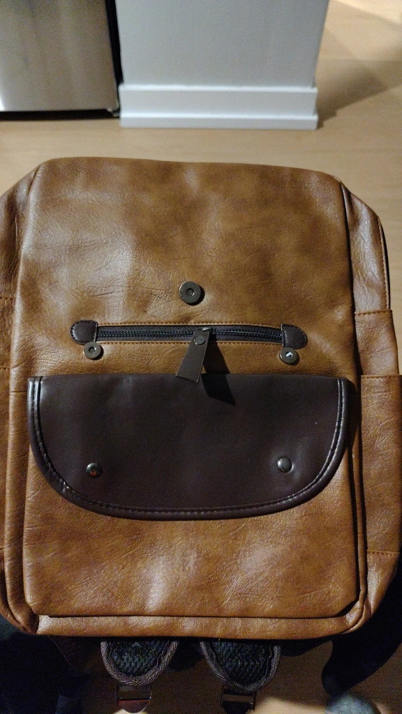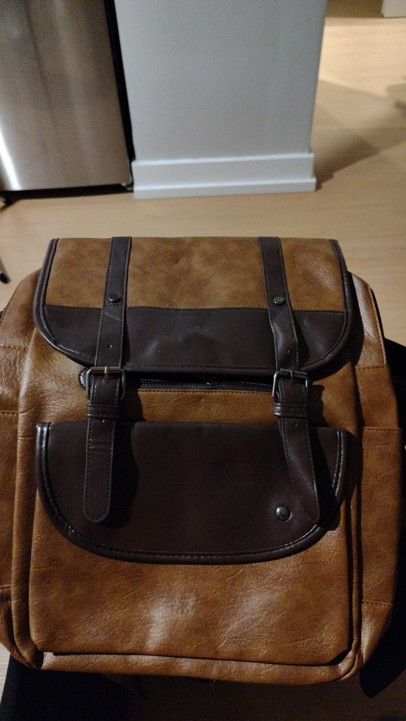 Here's a stylish brown leather backpack. It features a dark brown accent pocket and straps. Perfect for everyday use or travel!