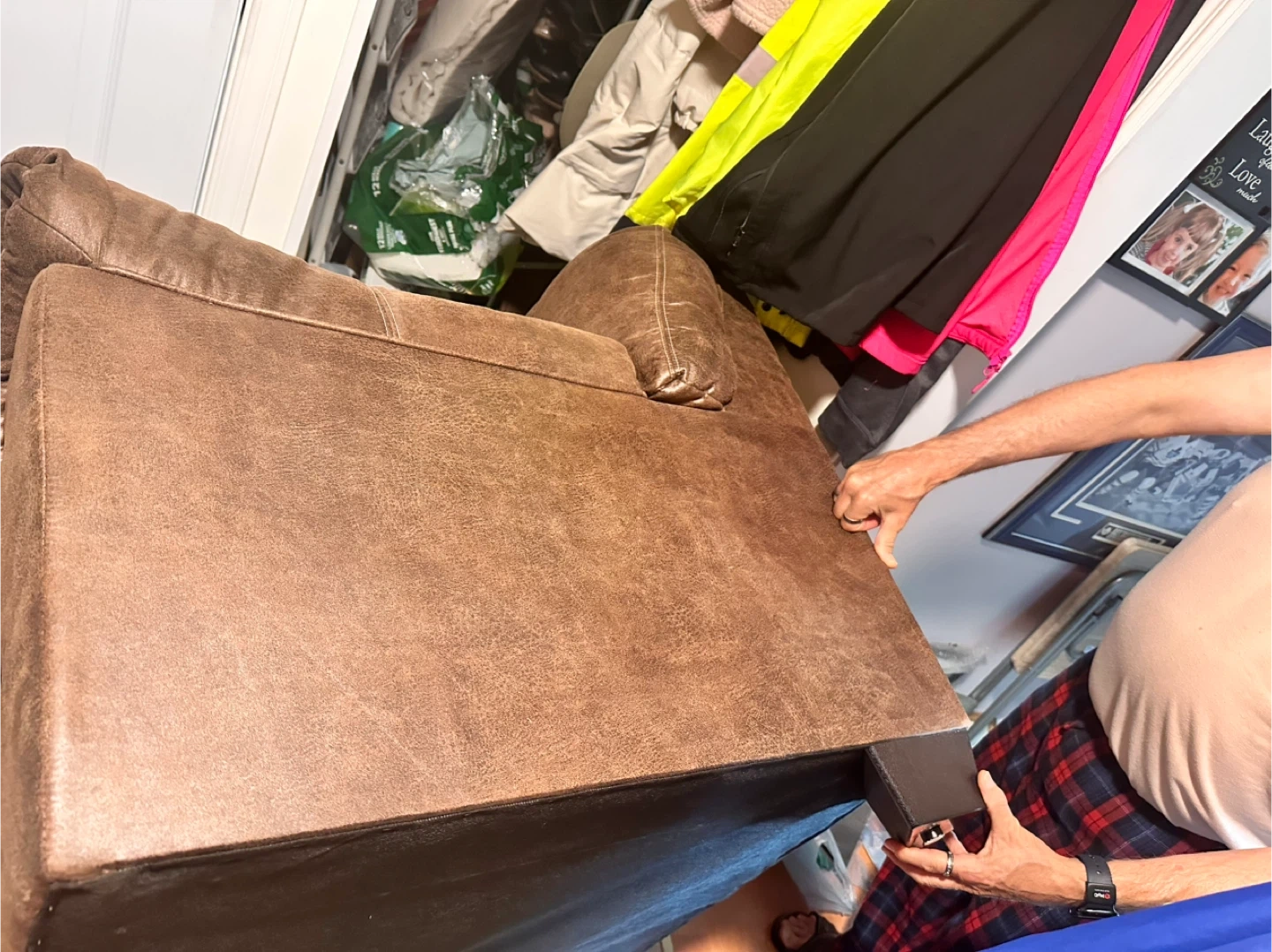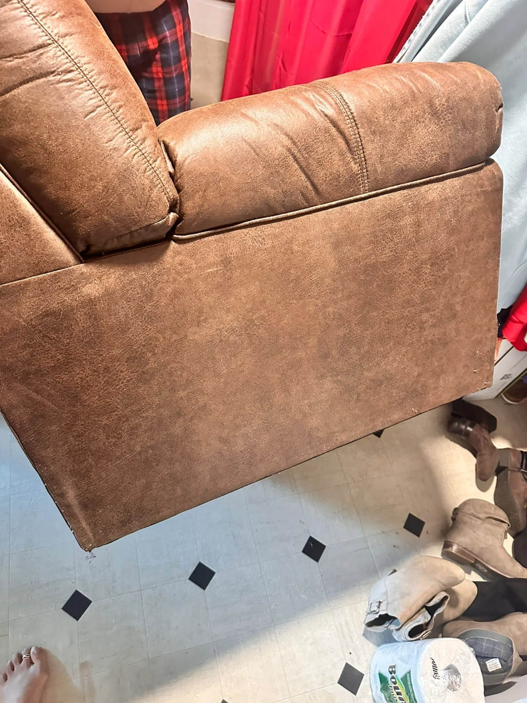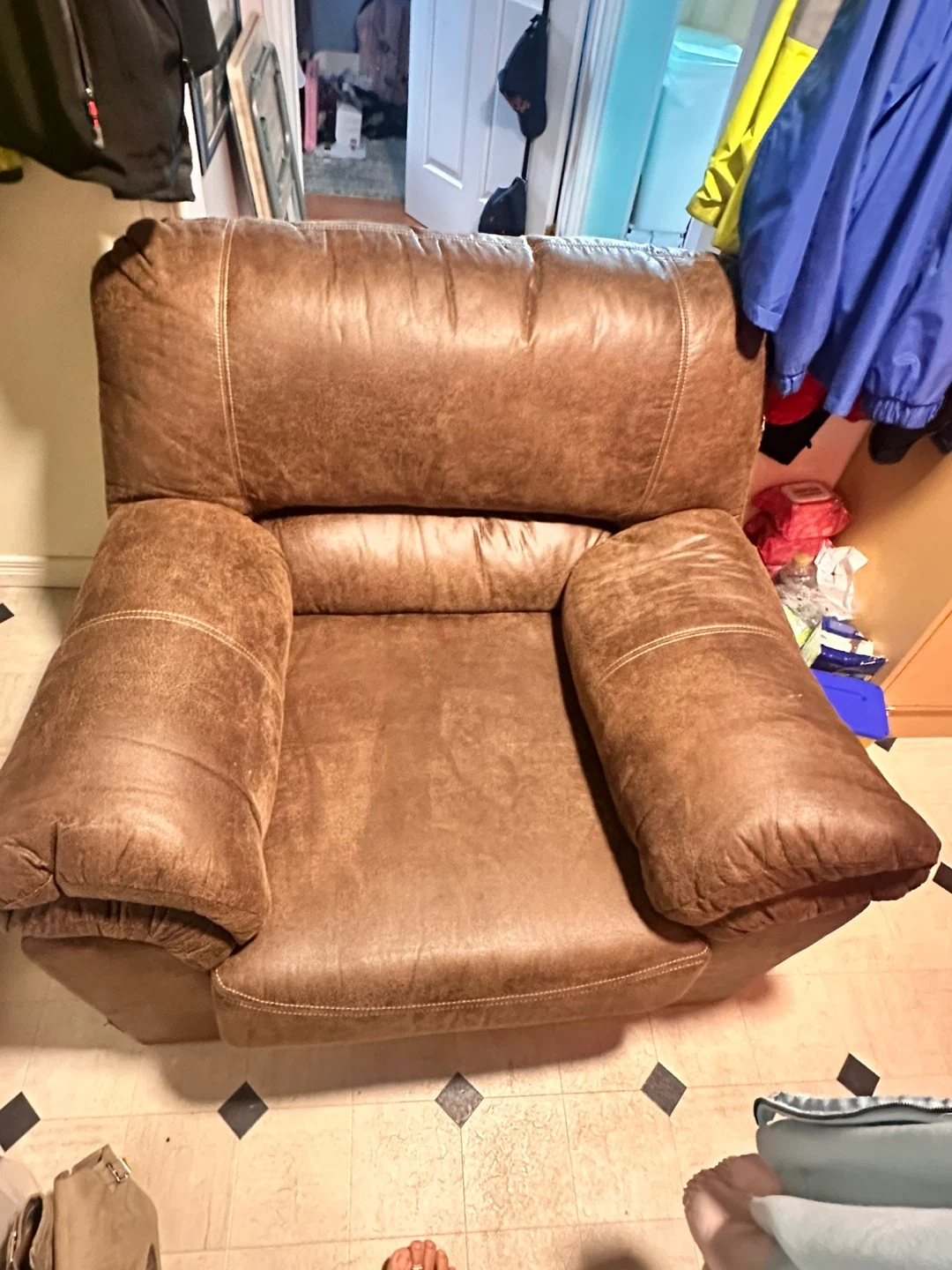 This brown microfibre is super comfy and ready for a new home! It's in excellent condition and perfect for relaxing after a long day. The leather has a nice, soft texture. It would be great in a living room or den. Switched to a recliner so it’s not needed anymore