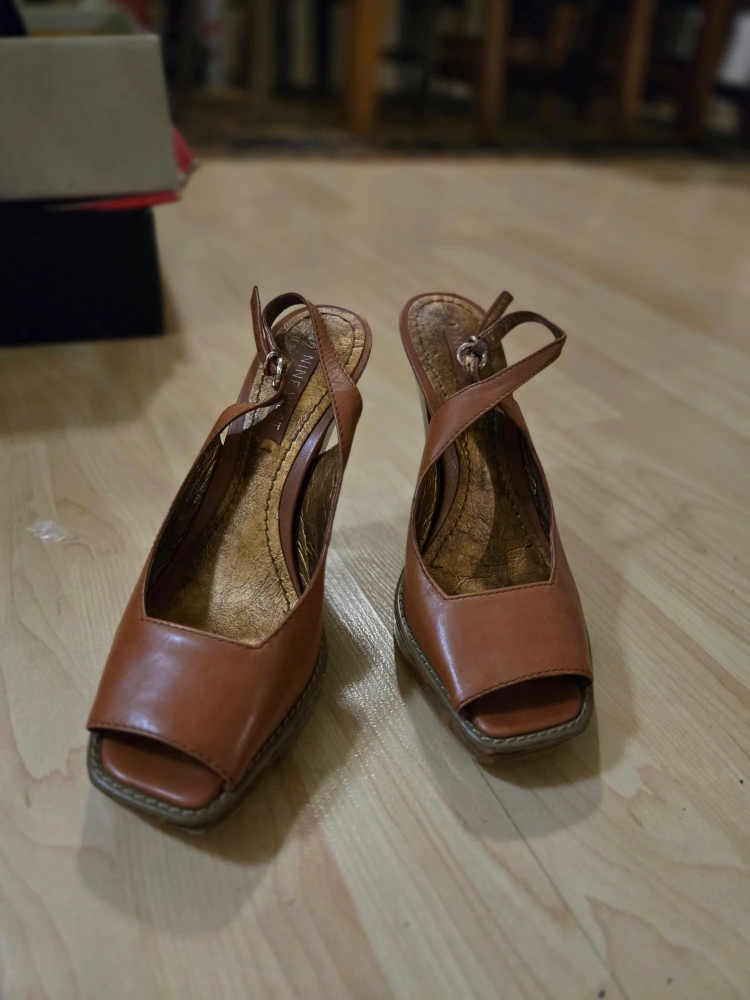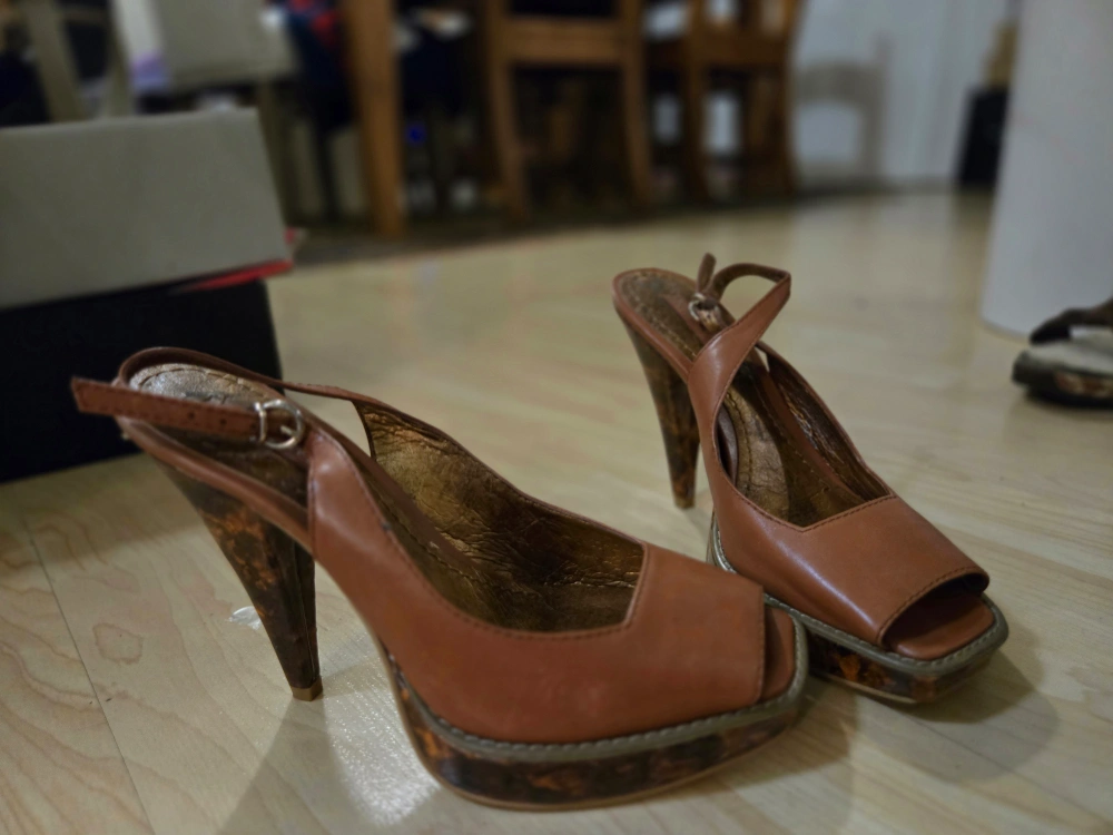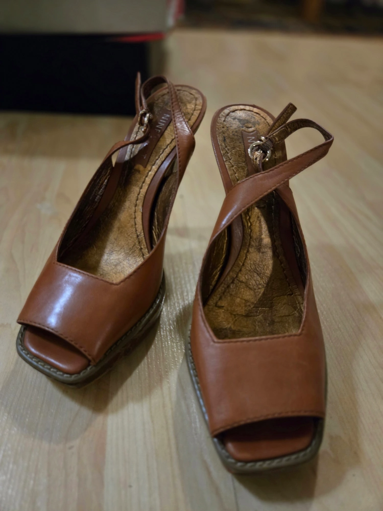 These are a pair of stylish brown leather heels. They feature a peep toe and an ankle strap. Perfect for dressing up or down! Reason of Selling: I am moving to new place. Only available for pick up.