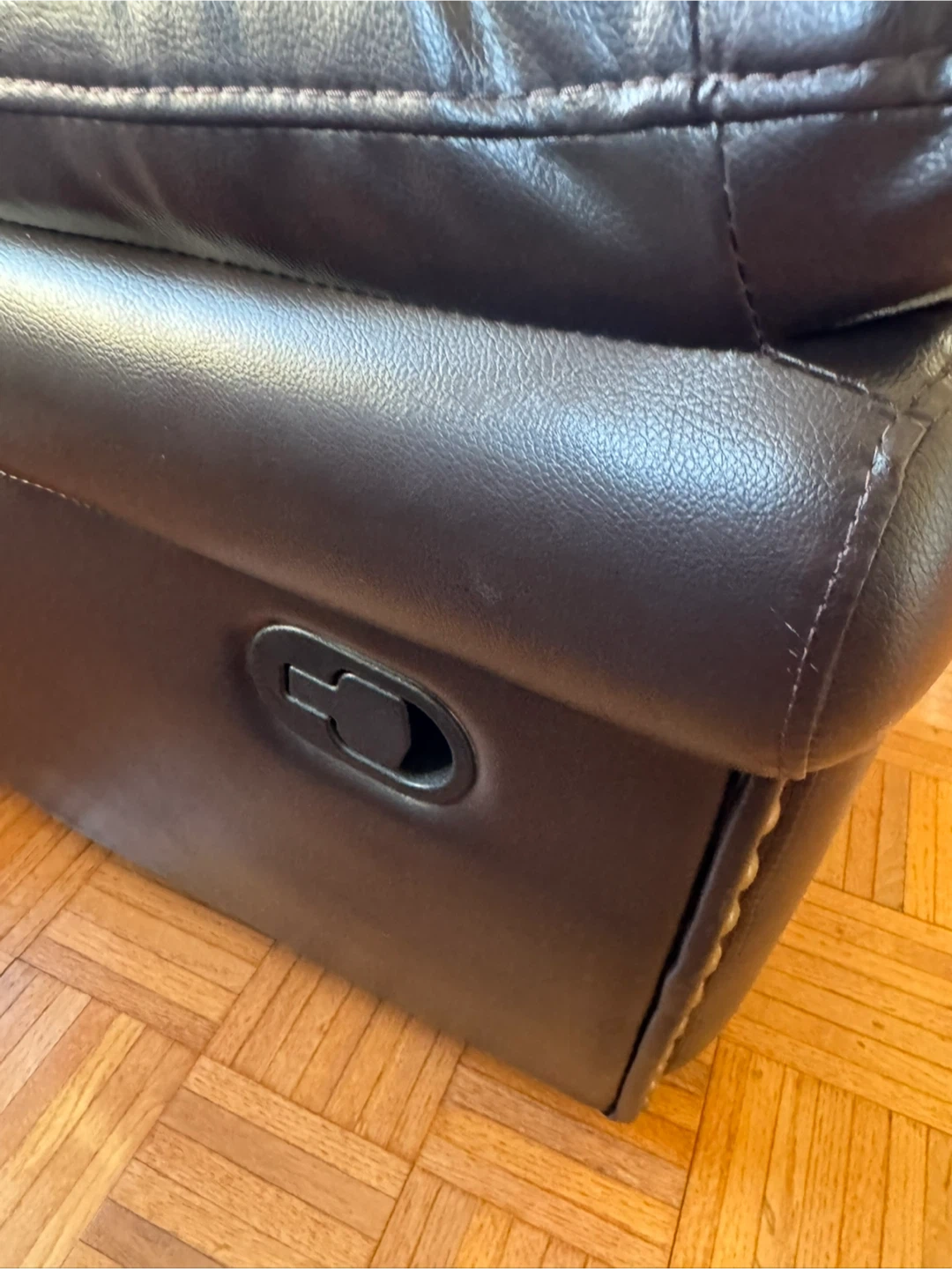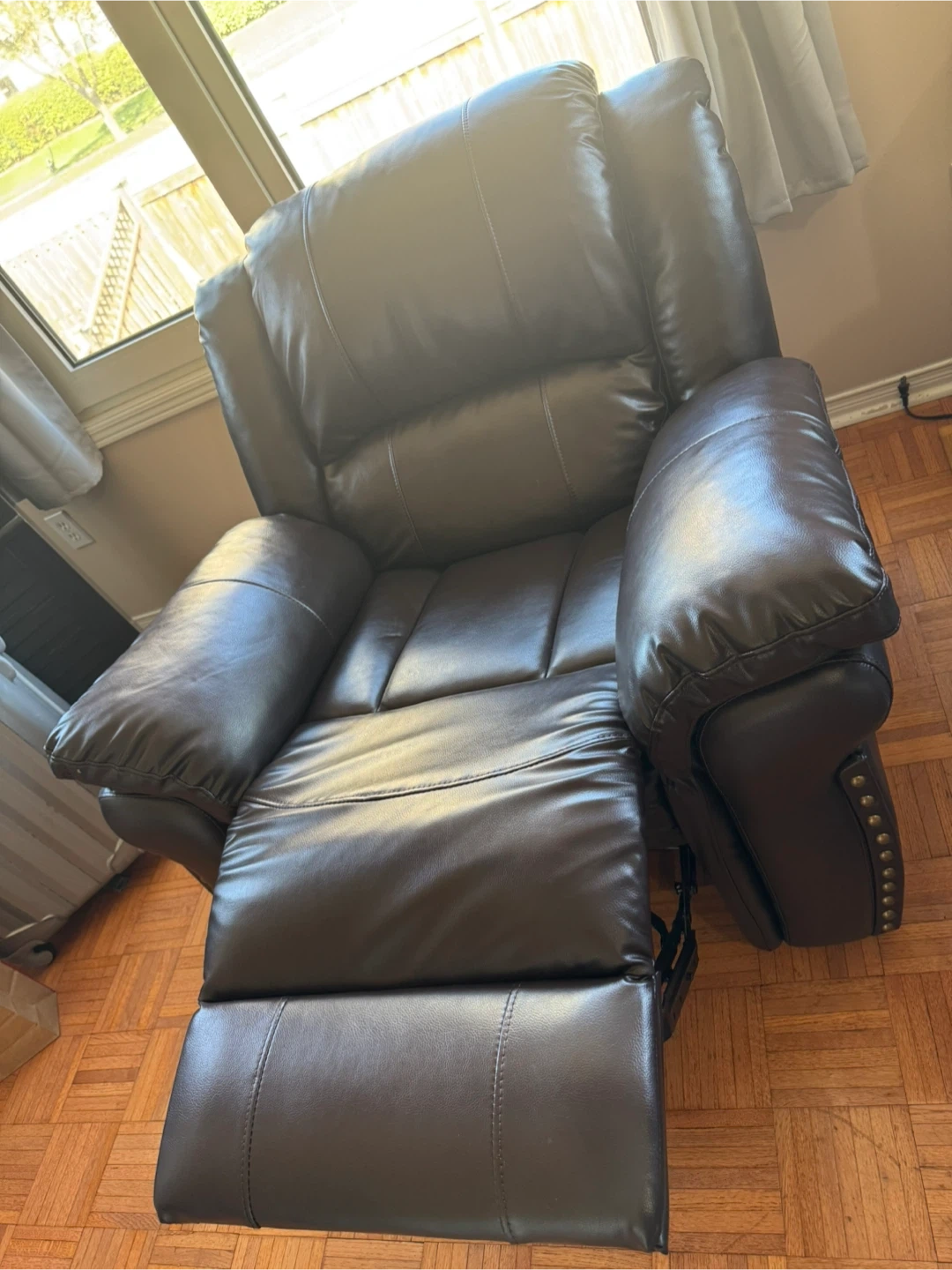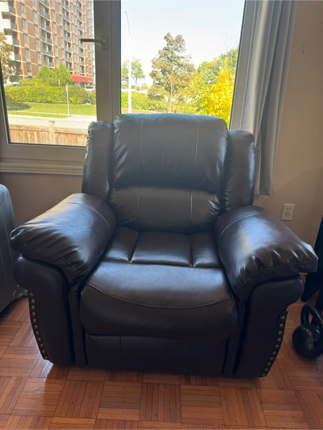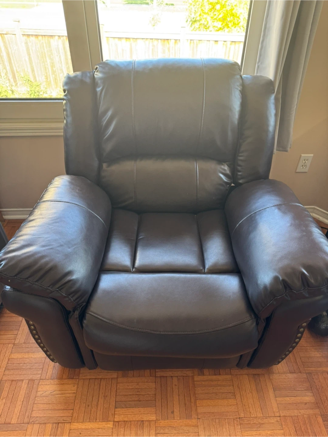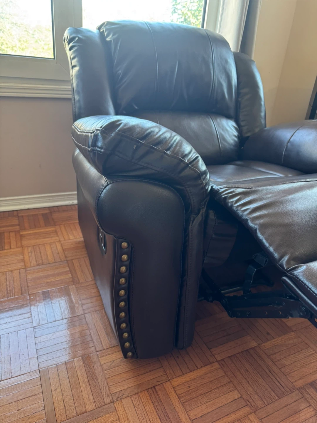 Selling a comfy brown leather recliner chair! It's in great shape and perfect for relaxing after a long day. It has a manual reclining function on the side. The chair has some decorative studs on the side.