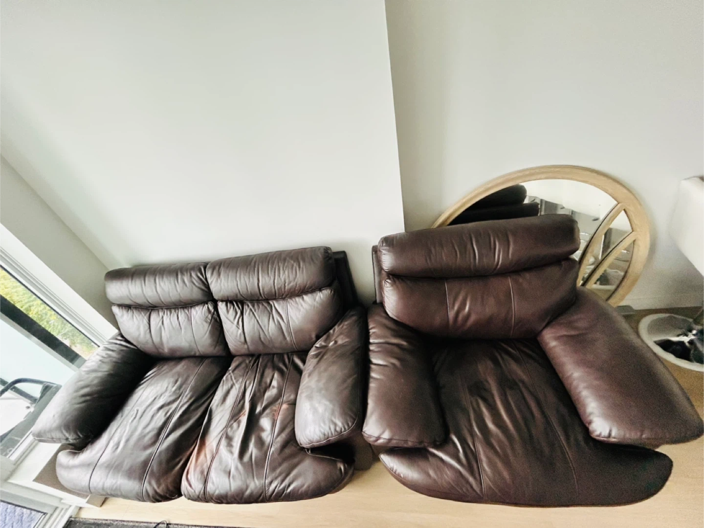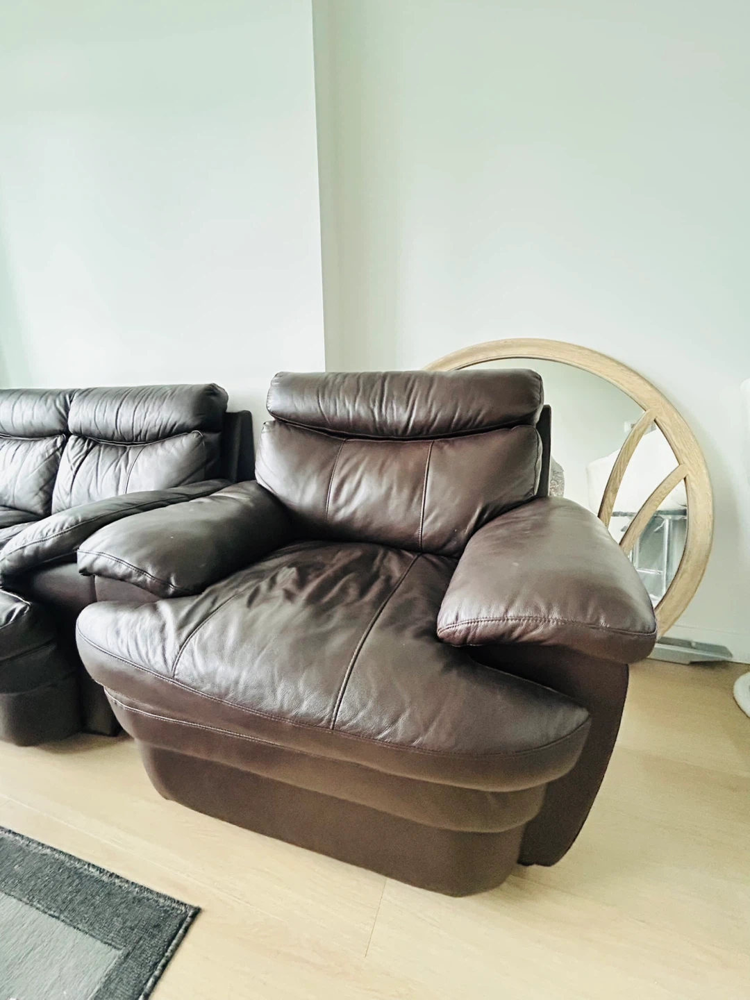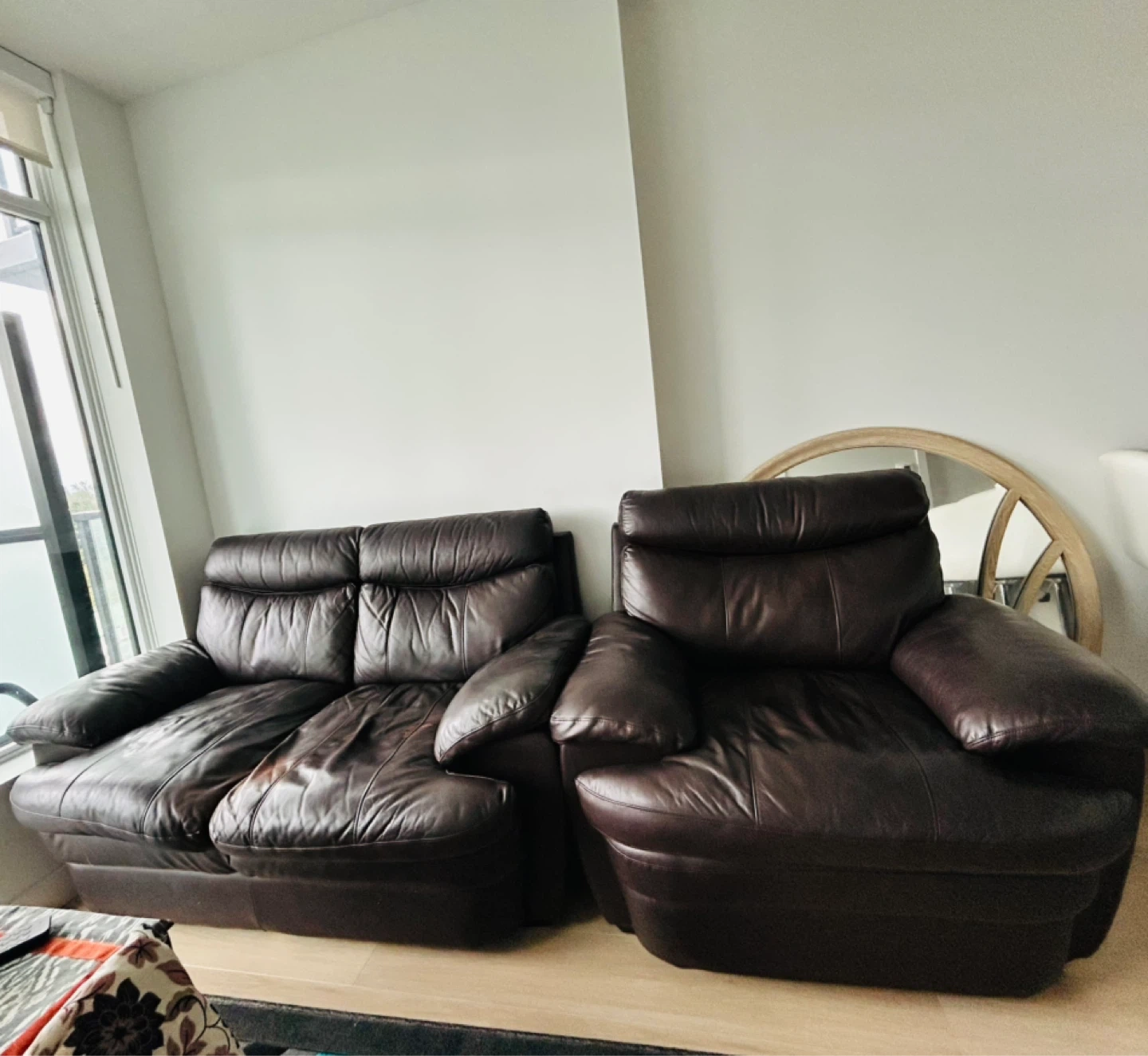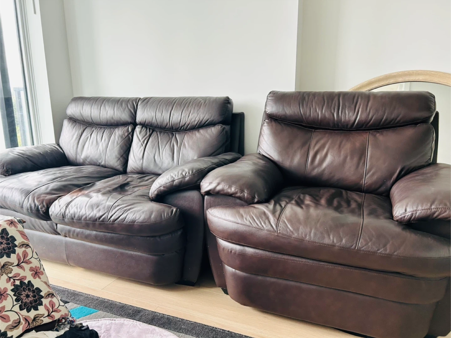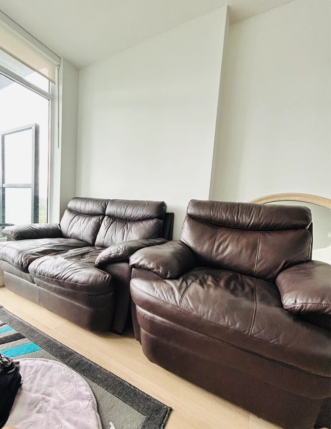 Upgrade your living space with this stylish and cozy sofa set! Perfect for families, movie nights or simply relaxing after a long day. These pieces offer both comfort and lasting quality. 2- seater sofa- 64*37*37” Armchair- 37*43*37” Gently used and well maintained. Shows minor signs of wear consistent with normal use, adding to its character without compromising comfort or function.