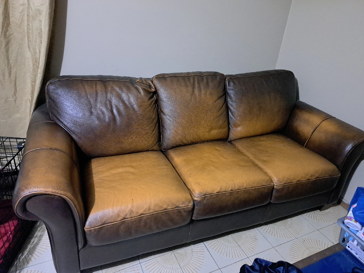 Selling a comfy three-seat sofa with a classic brown leather finish! It's perfect for a living room or den area. The sofa has a well-loved look, adding character to any space. It's ready for a new home!