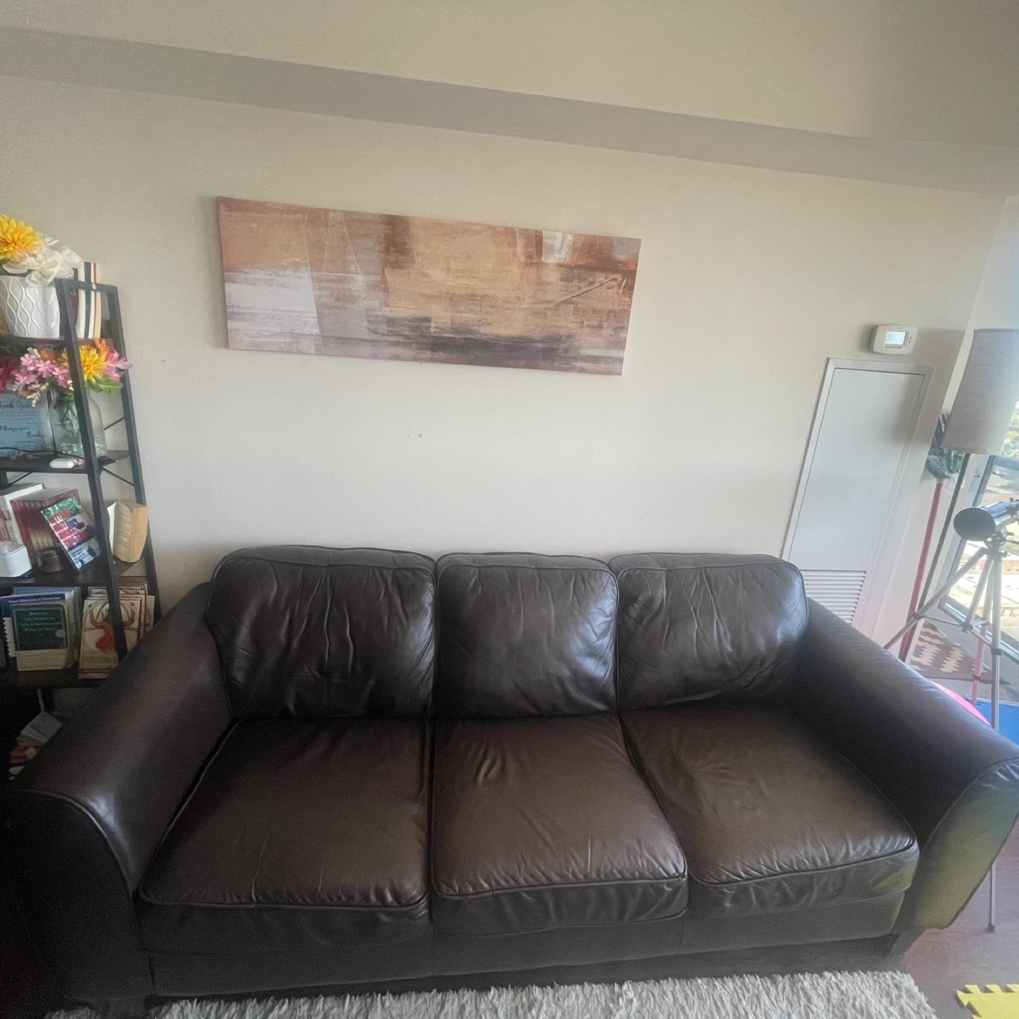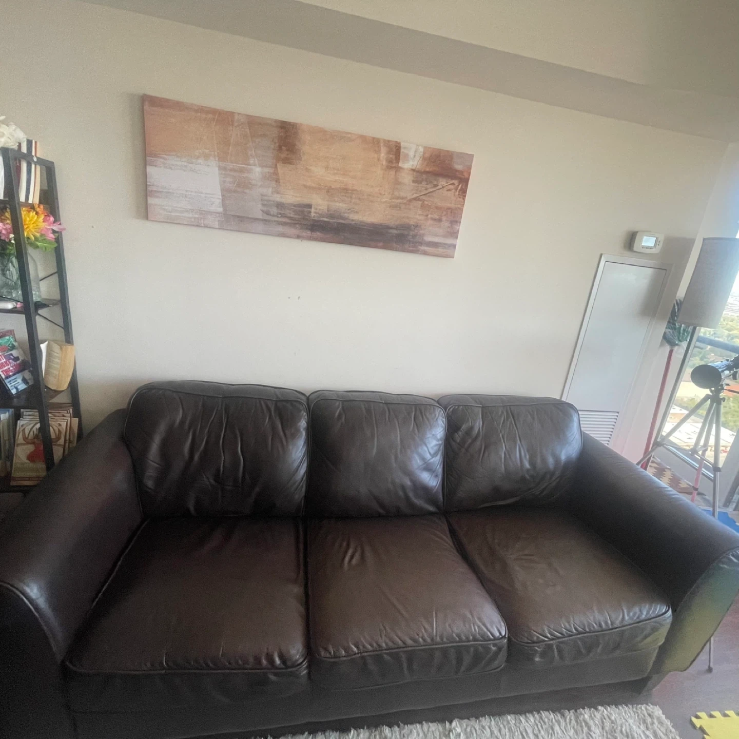 Selling a comfortable brown leather three-seater sofa. It's perfect for a living room or den. The sofa is in good condition and ready for a new home! It's a great piece to relax on after a long day