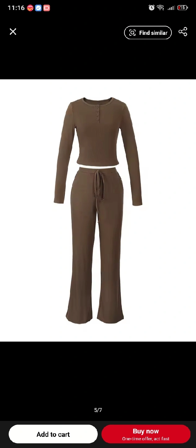 Selling a comfy brown lounge set! It includes a long-sleeved top with button details and matching pants with a drawstring waist. Perfect for relaxing at home or running errands. The material is soft and cozy!