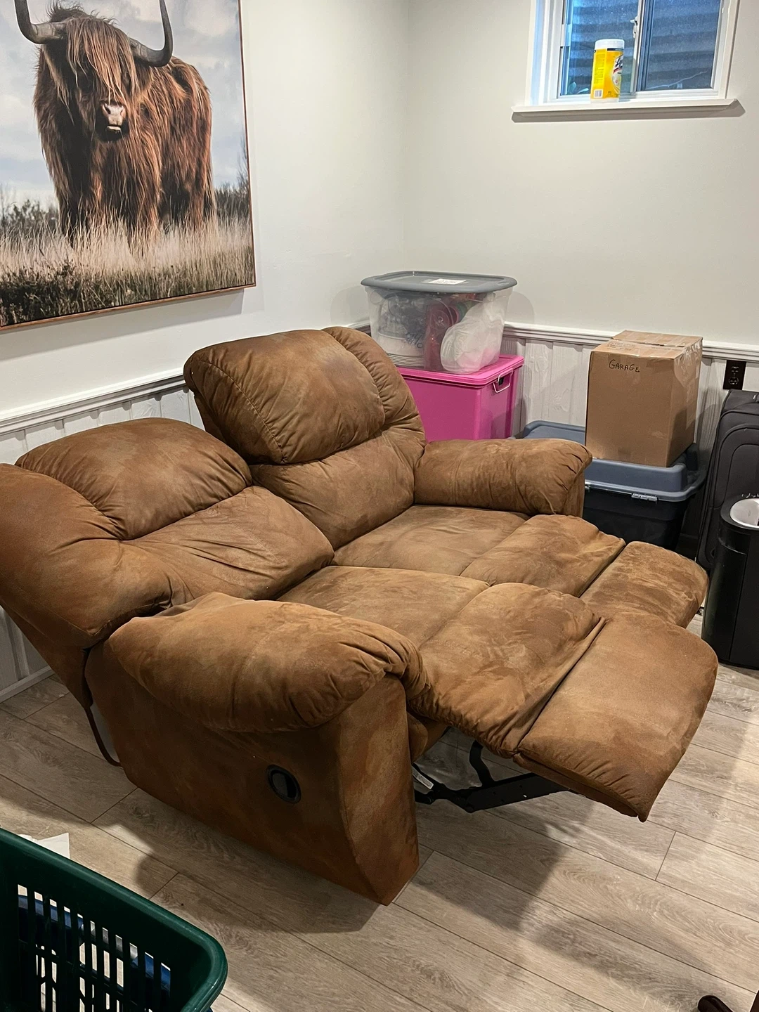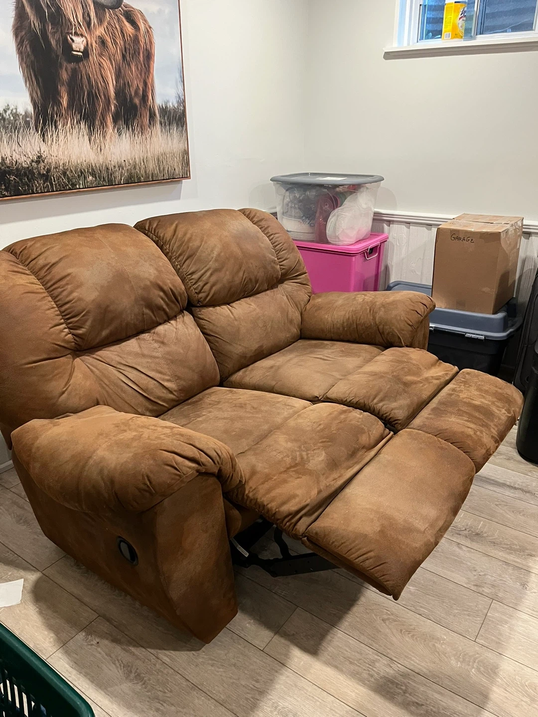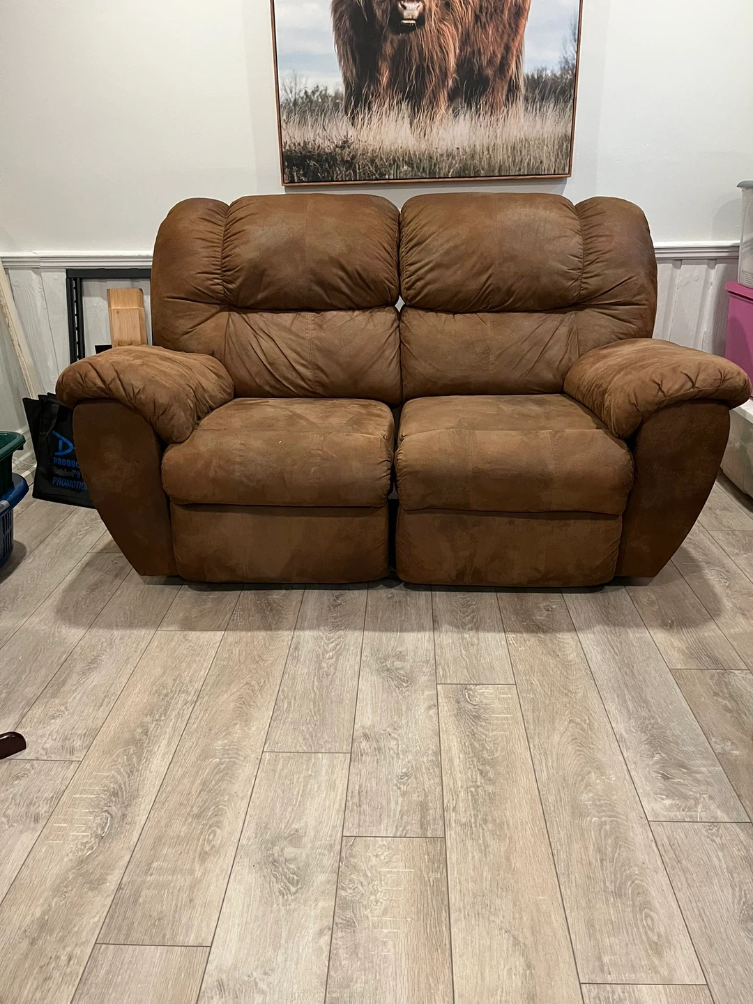 Cozy up with this comfy brown microfiber double recliner loveseat! It's perfect for relaxing and watching movies. The recliner mechanism works smoothly, and the microfiber material is soft to the touch. It's in good used condition and ready for a new home