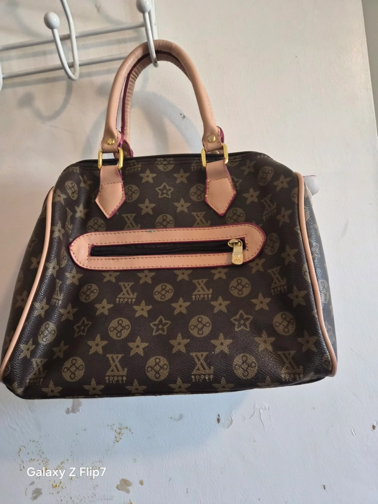 Here's a cute handbag with a brown patterned design! It features a beige trim and handles, giving it a stylish look. The bag has a zippered closure and gold-tone hardware. It's in great condition and ready for a new home!