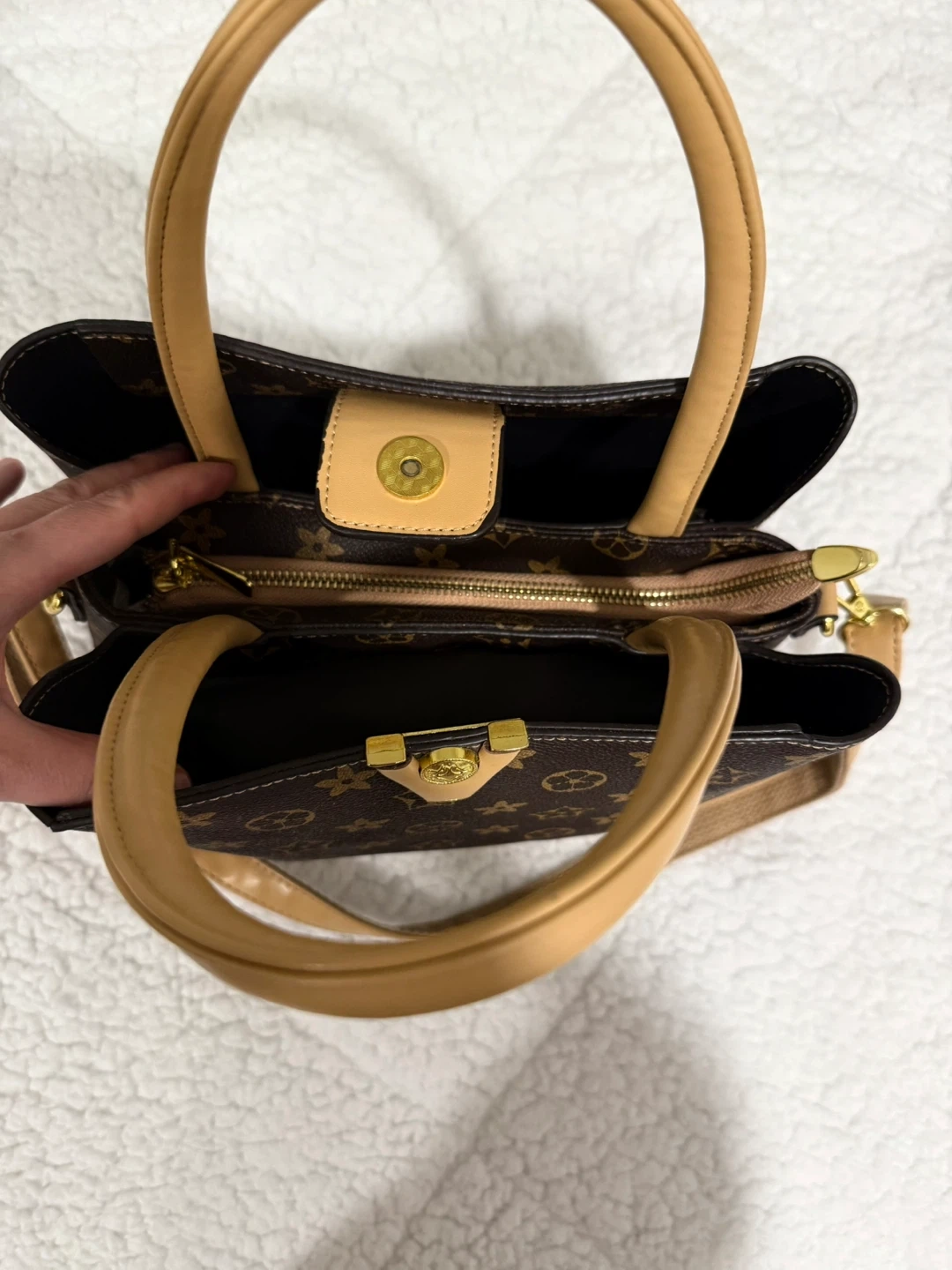 This cute brown patterned handbag is in great condition! It features a unique design with stars and floral patterns, along with tan handles and an adjustable shoulder strap. Perfect for adding a stylish touch to any outfit!