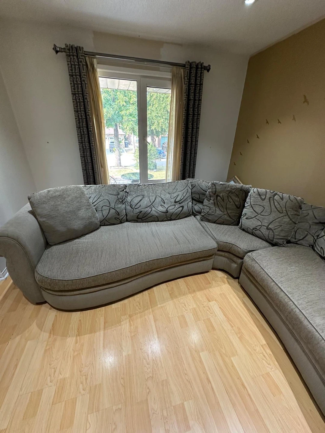 Selling a comfortable sectional sofa in a neutral brown colour with a subtle patterned design. It's in great shape and perfect for a living room or family room. Comes with matching cushions for extra comfort!