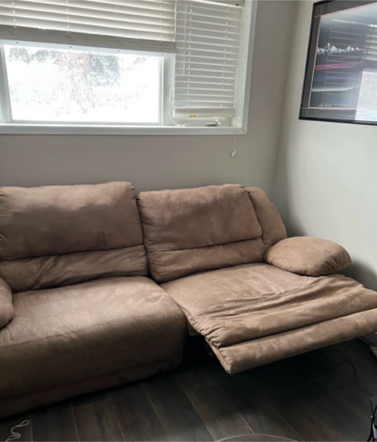 Gently Used Ashley Furniture Two seated Recliner When sitting on couch the left side reclines perfectly but the right side a piece broke before I bought it and can be fixed I just never bothered with it. Its 90” long & 34” tall no rips or stains its in very good condition & very comfy Too big for my living room needs to be gone asap Pet friendly smoke free home Its not heavy just awkward bring help to move it will be ready for pick up $100 OBO cash only Pickup in Red Deer Westpark