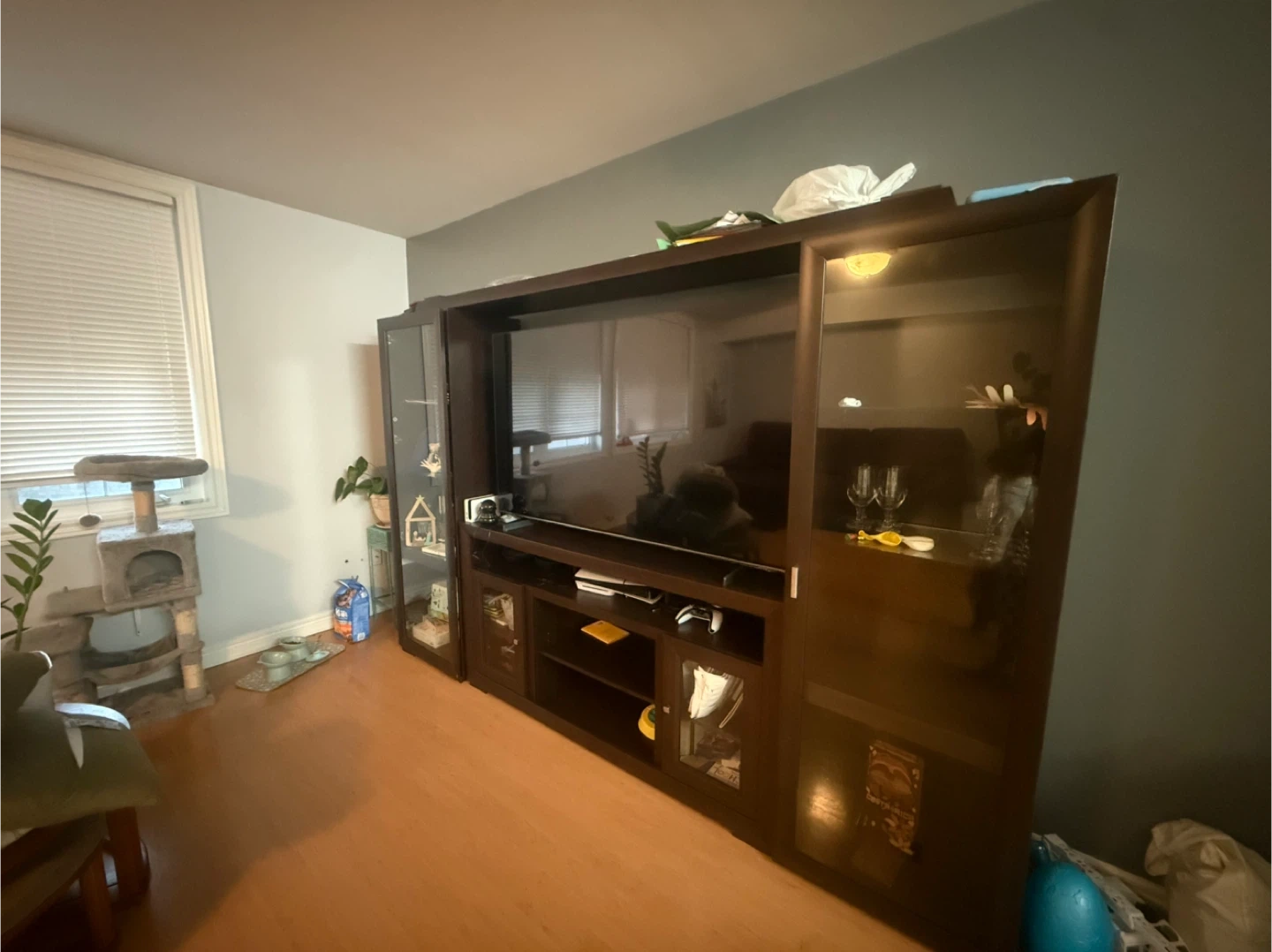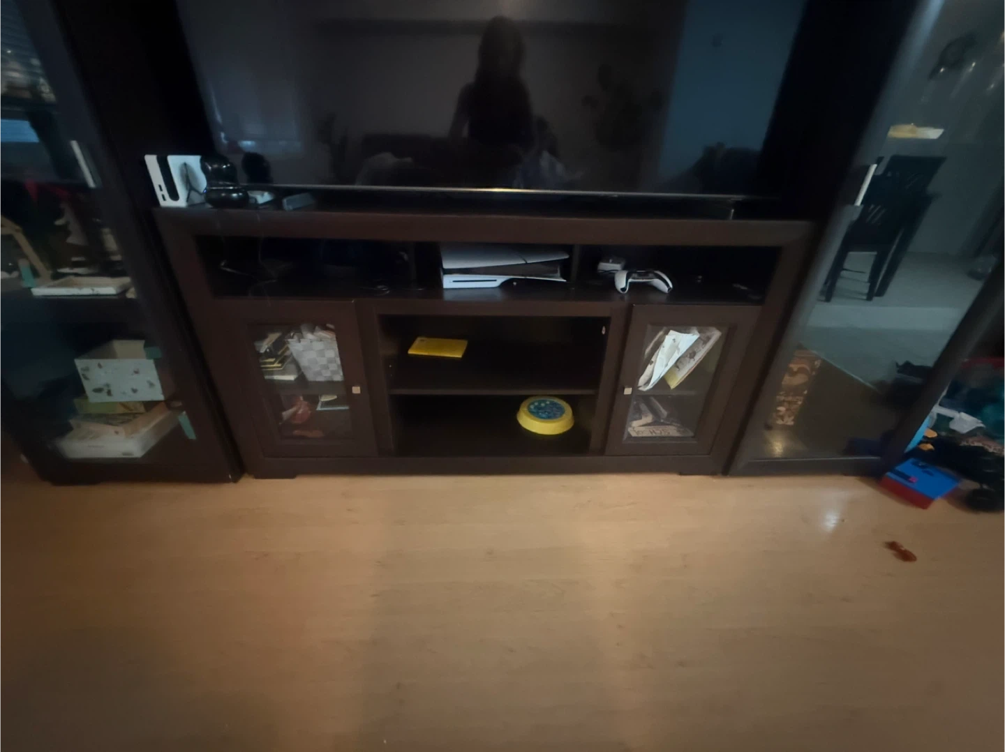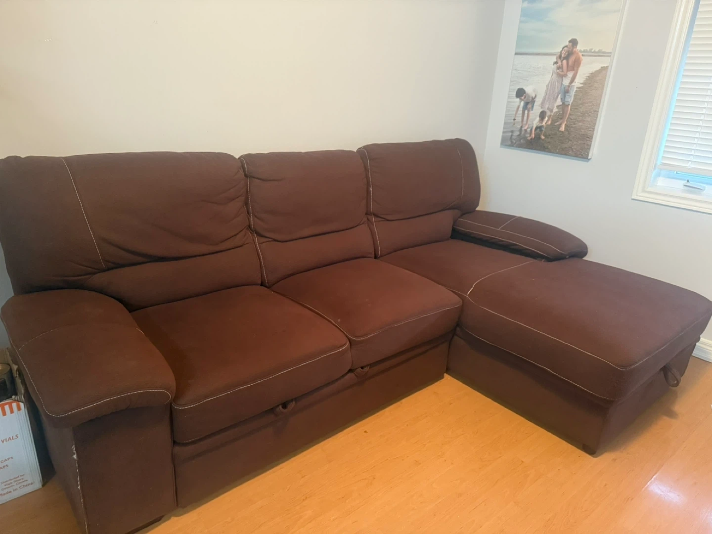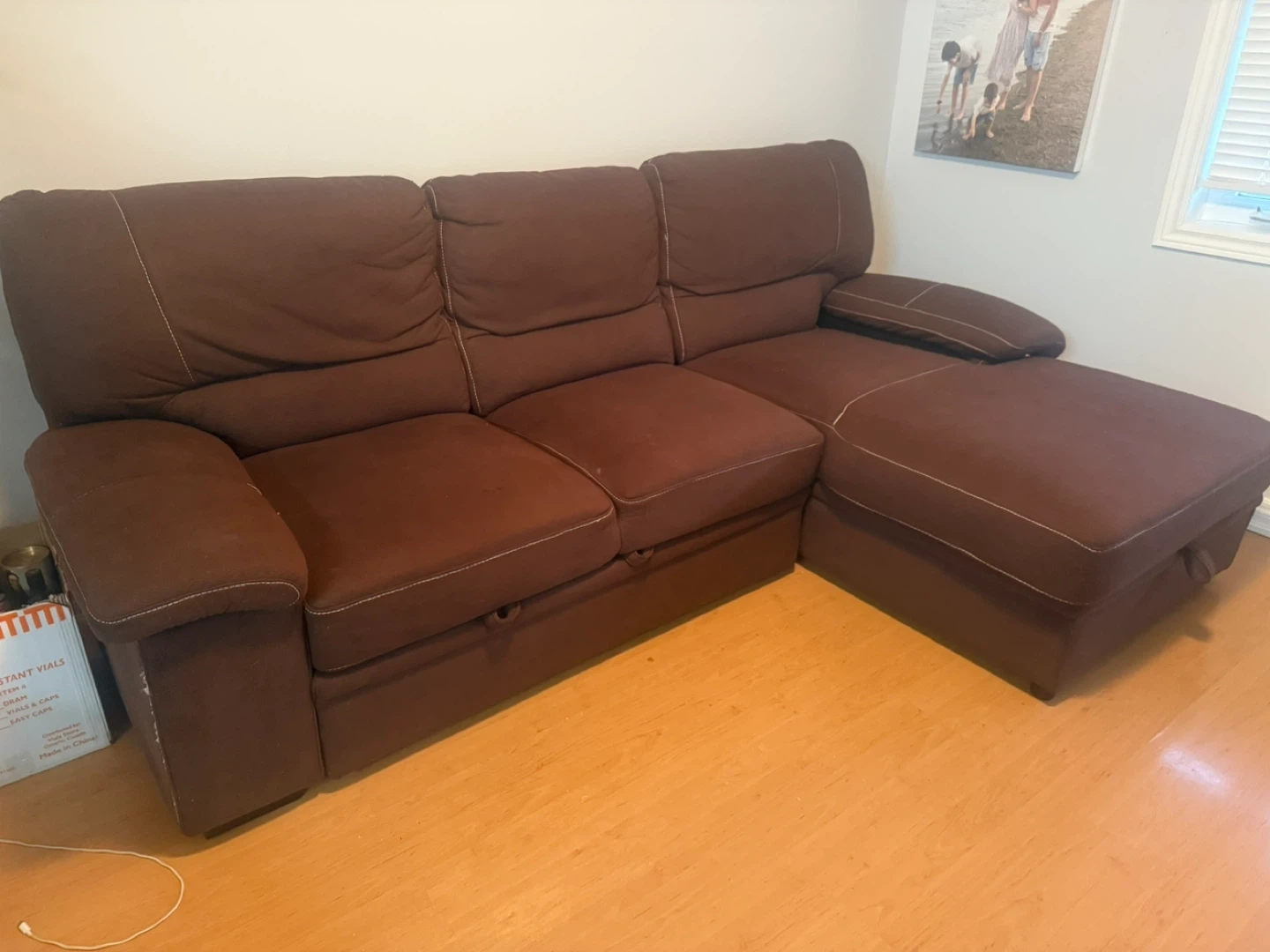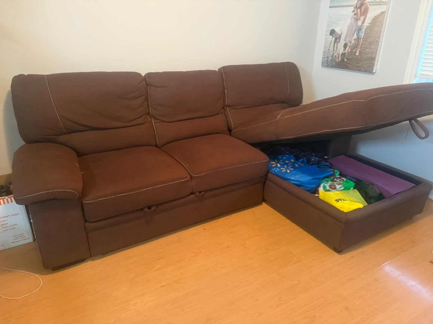 Selling a brown sectional sofa with a storage compartment. It's in good condition and has a pull-out storage area for extra blankets .also entertainment unit , Both pieces are available for pick up!
