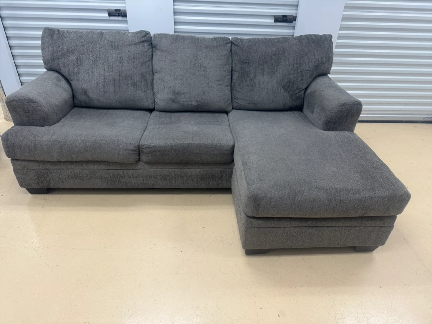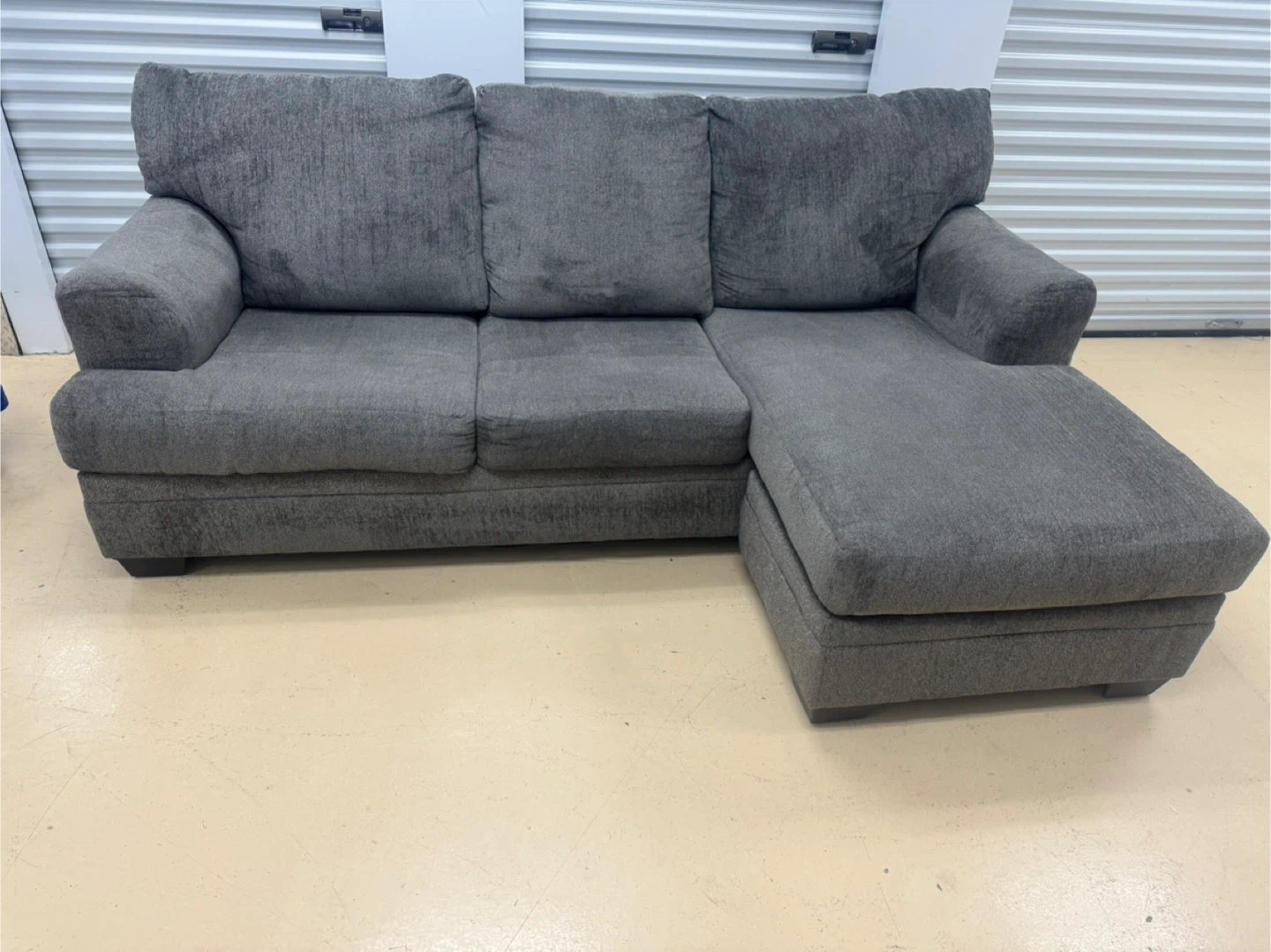 Selling a comfy grey sectional sofa with a chaise lounge. It's in good condition and perfect for a living room or den. The chaise is great for relaxing and stretching out. The sofa is a nice neutral grey colour that will match most decors good condition home delivery available