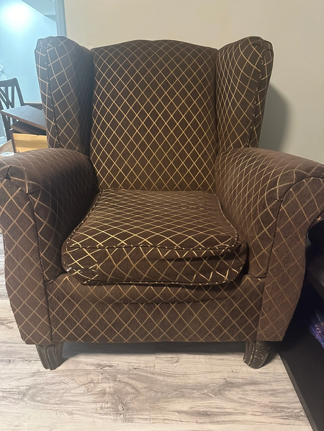 Brown sofa and matching armchair with a brown and gold geometric pattern. Sofa is a sectional with a chaise. Both pieces are in good condition. Pick up only.