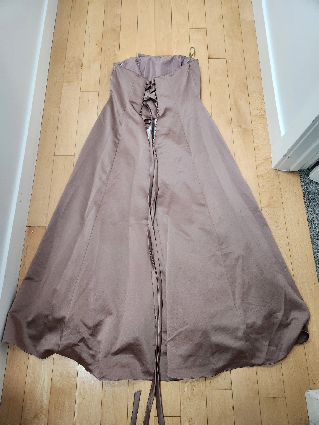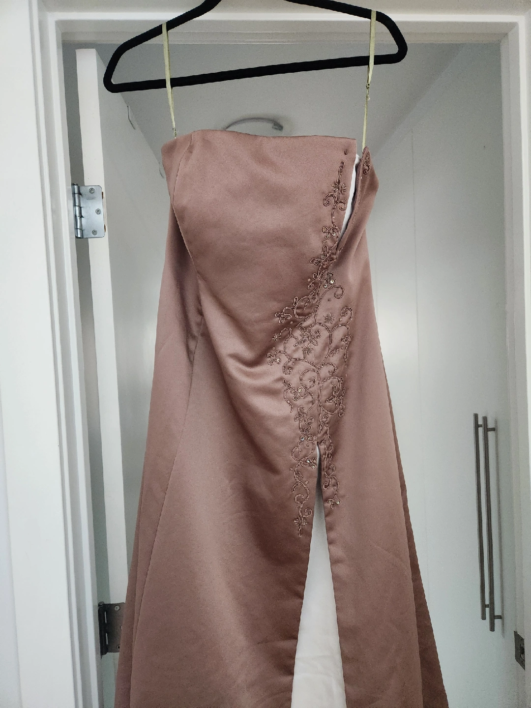 Selling a beautiful strapless formal dress - size large in great condition. It's a lovely brown colour with some delicate detailing on the front. The dress has a slit and a lace-up back. Comes from a smoke and pet free home.