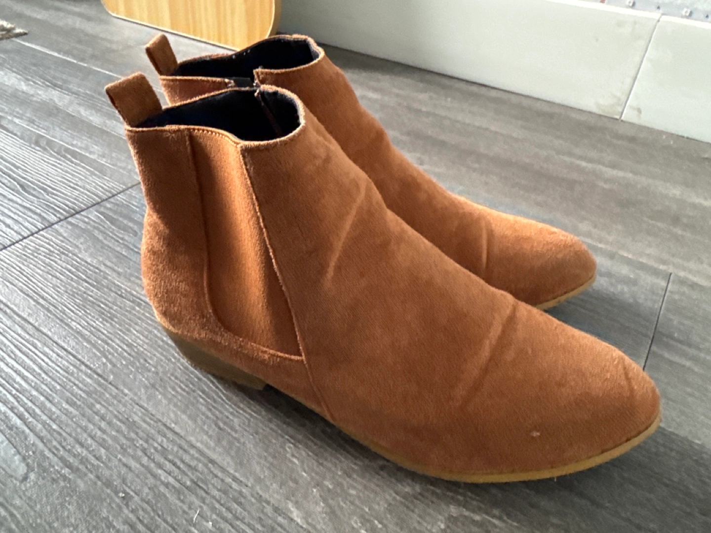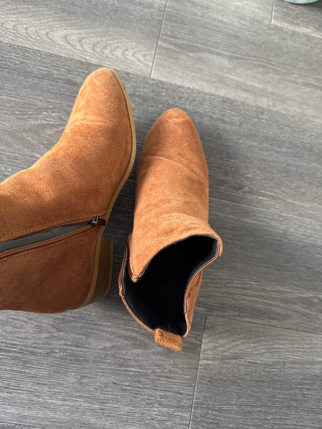 Pair of brown suede ankle boots. Low heel. Side zipper. Pointed toe.
