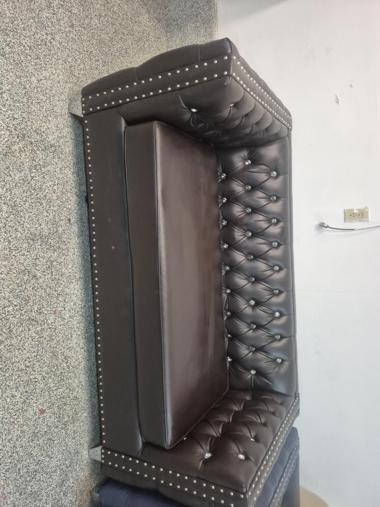 Selling a stylish brown settee featuring tufted faux leather and silver nailhead trim. It's in great shape and would look lovely in a living room or entryway. The design includes crystal-like buttons for an elegant touch