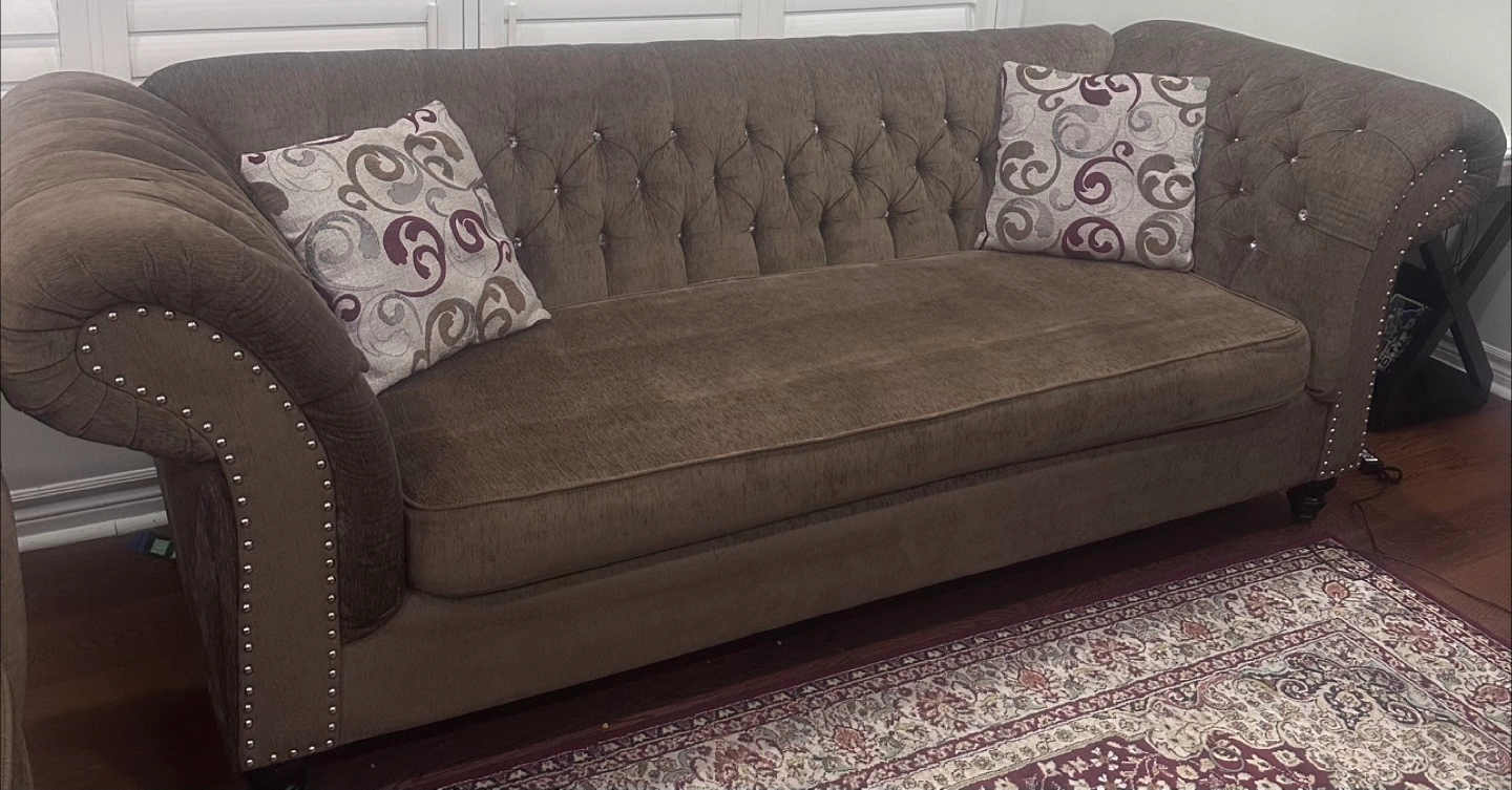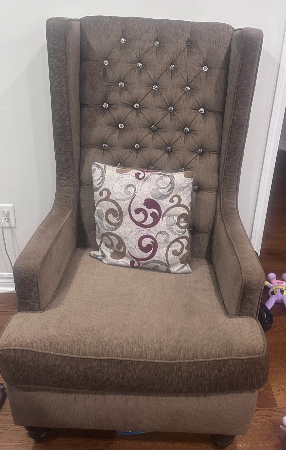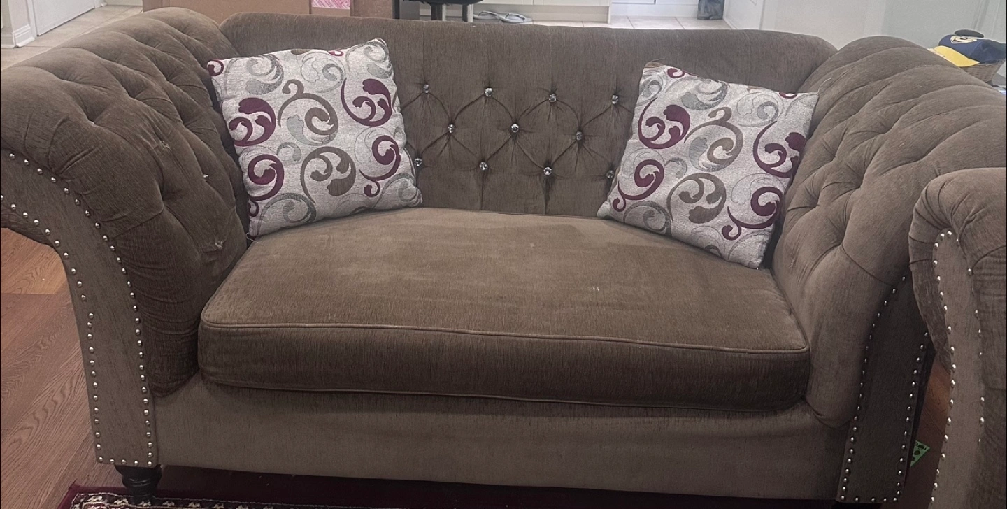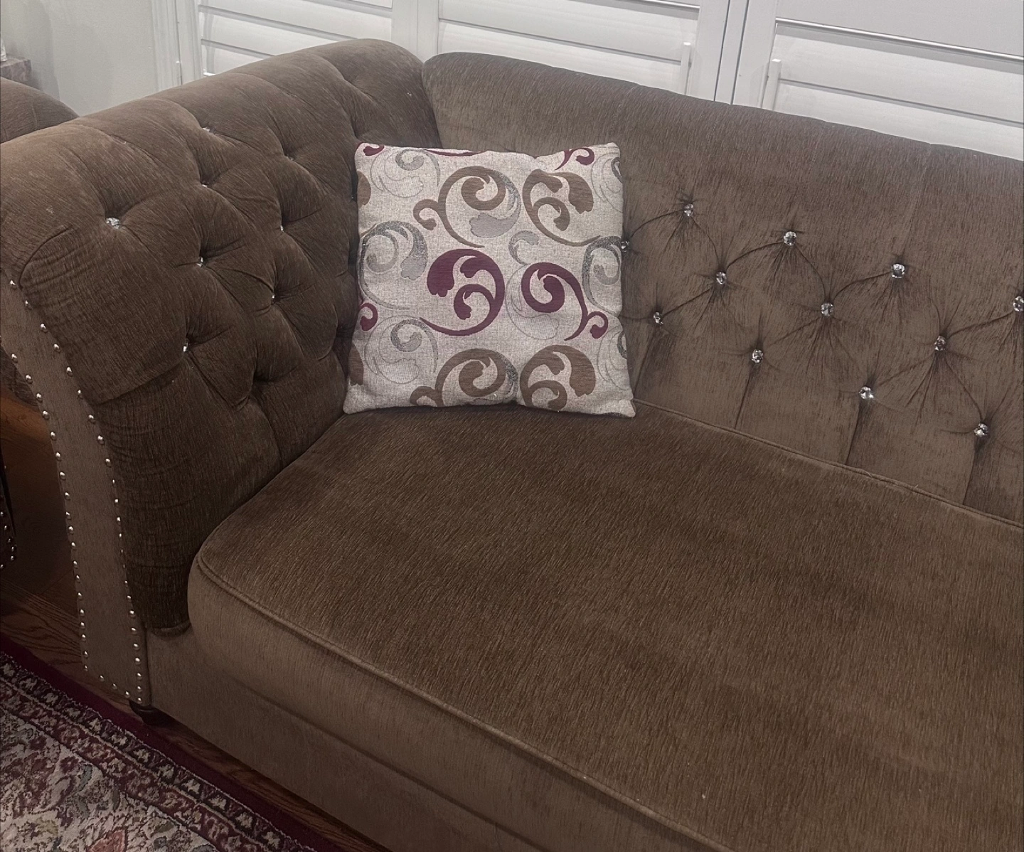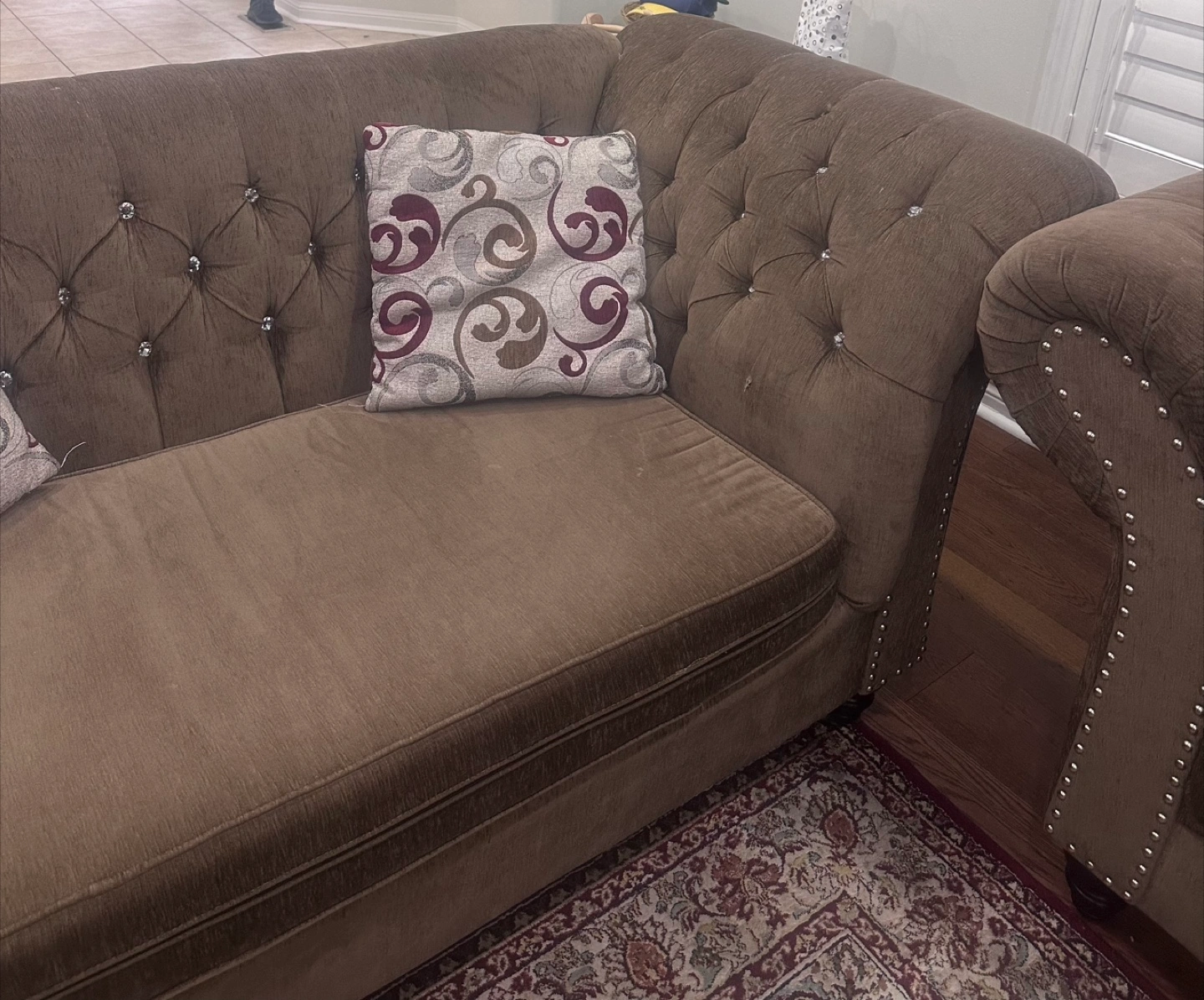 Selling a lovely brown tufted sofa and armchair set. The set features detailed tufting and nailhead trim, adding a touch of elegance to any living space. It's in great condition and ready for a new home!
