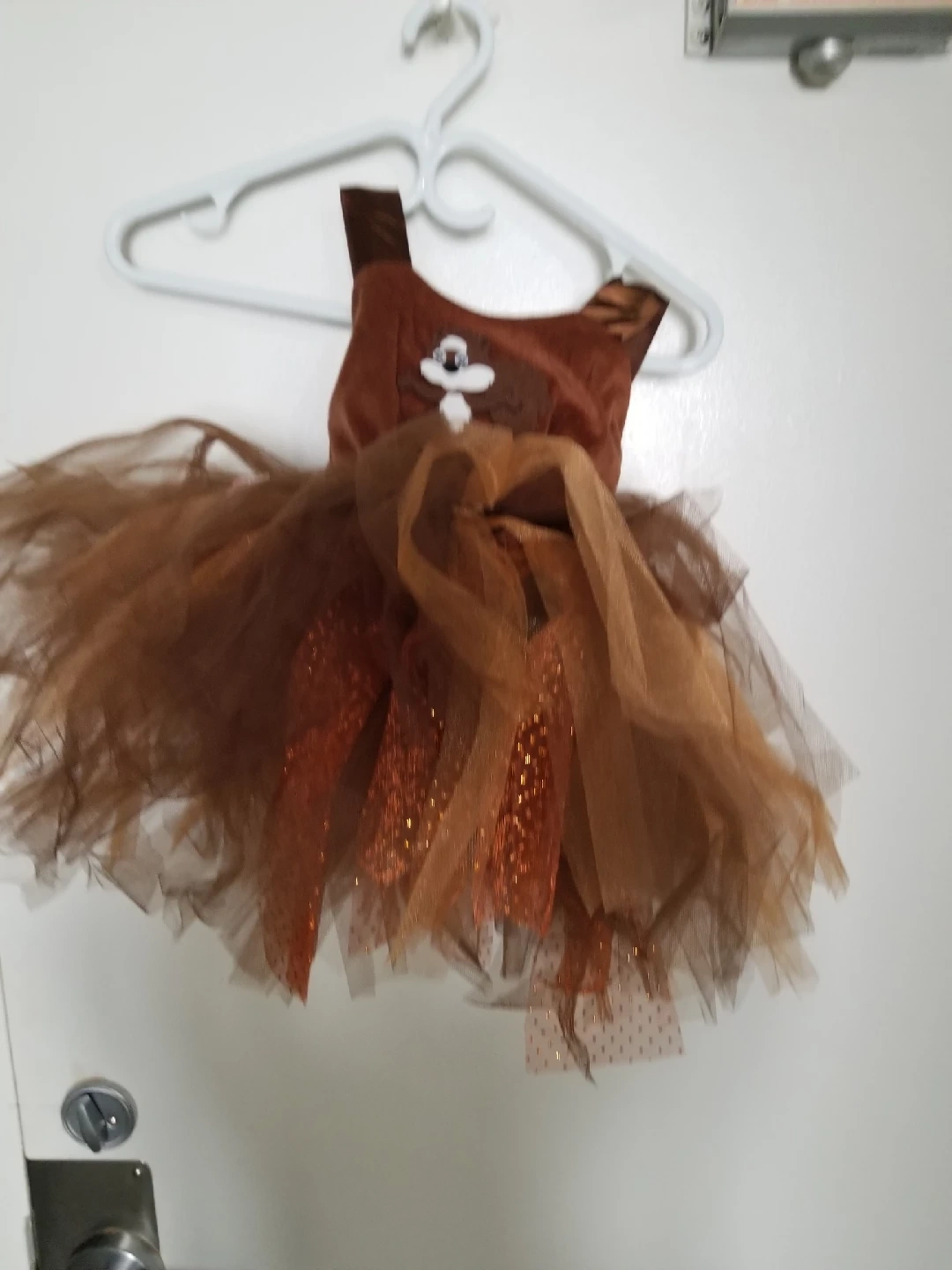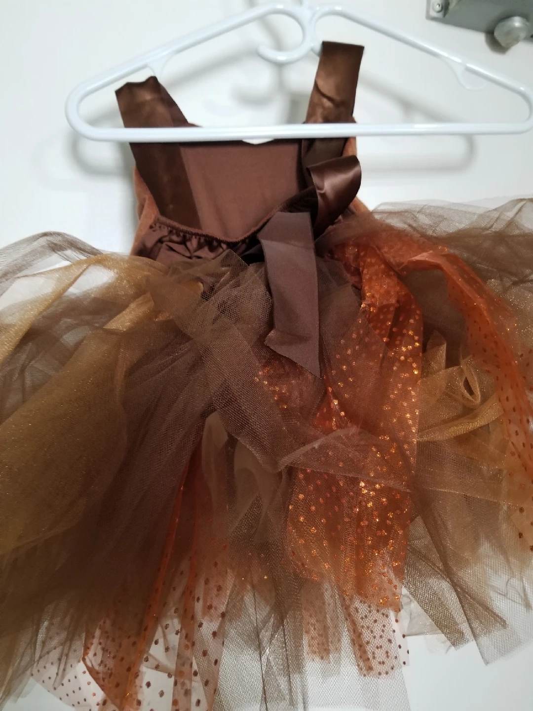 A cute brown tutu dress, perfect for a special occasion or dress-up! The dress features a brown top and a multi-layered tutu skirt in shades of brown and gold. There's a sweet squirrel appliqué on the front. The tag shows the brand IWEMEK.