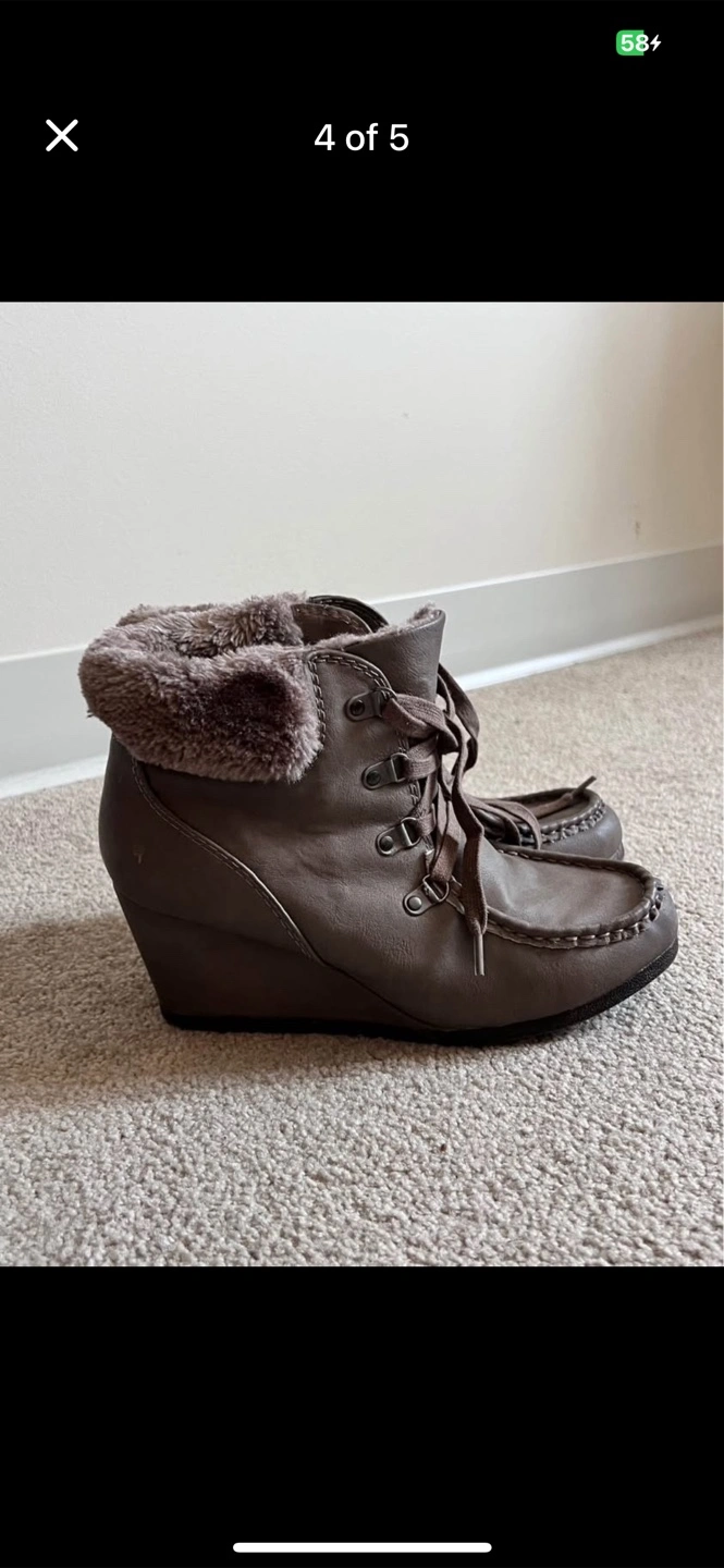 Cute brown wedge ankle boots in a women's size 8. They have a faux fur trim and lace-up detailing. Perfect for fall!