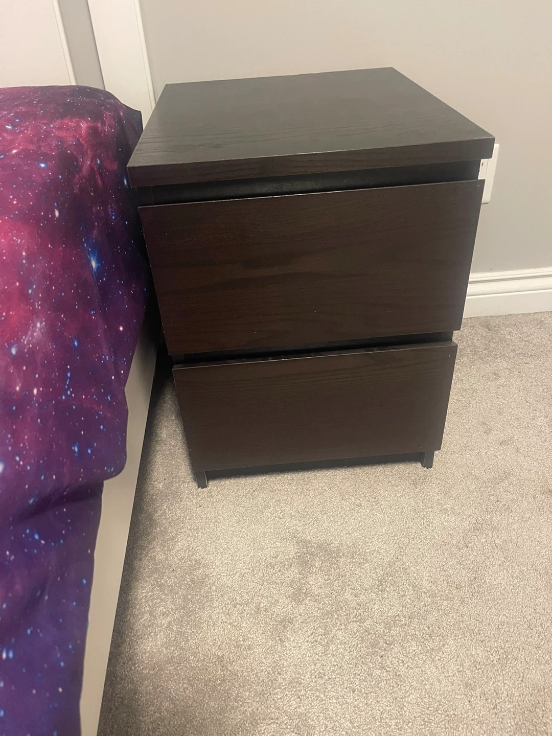 Selling a brown wood nightstand with two drawers. It's in great condition and would be a nice addition to any bedroom