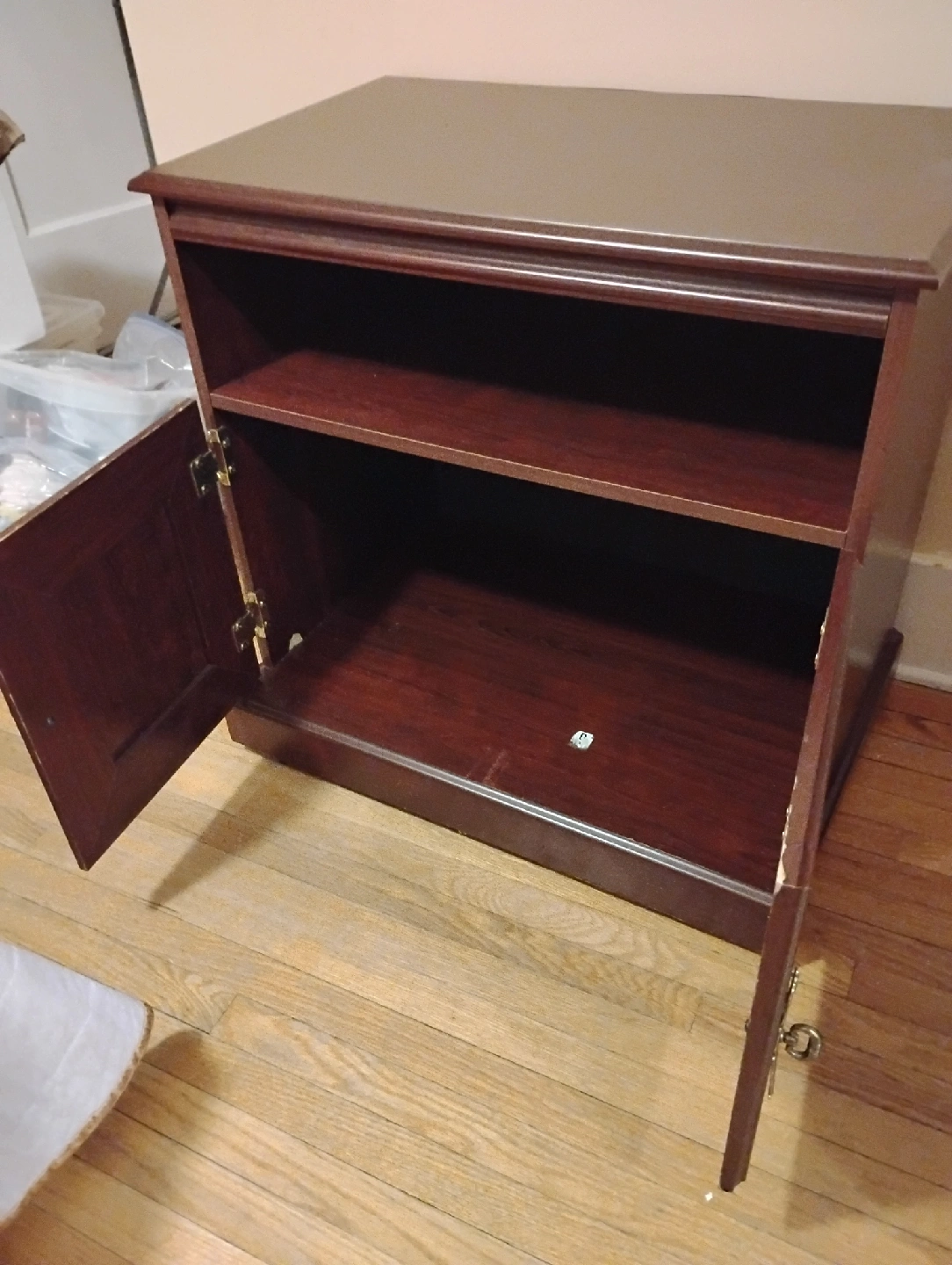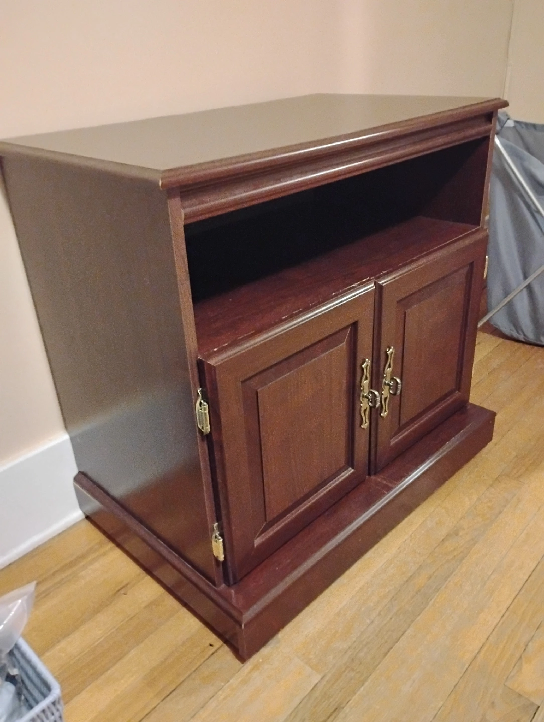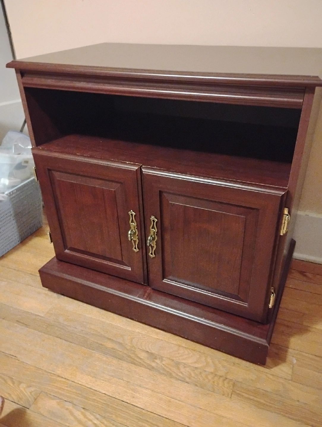 Here's a sturdy brown wooden TV stand cabinet! It features a shelf on top and a cabinet with two doors below, perfect for storing your media devices and accessories. It's in good condition and ready for a new home!