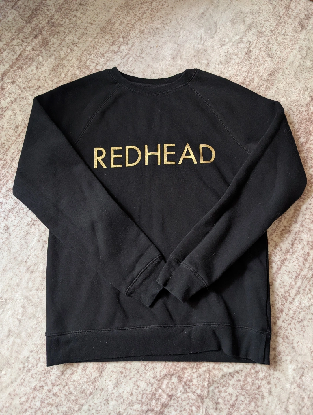 Cozy black crewneck sweater from Brunette The Label! This sweater features the word "REDHEAD" in gold lettering. It's a size XS/S and in great condition. Perfect for staying warm and stylish!