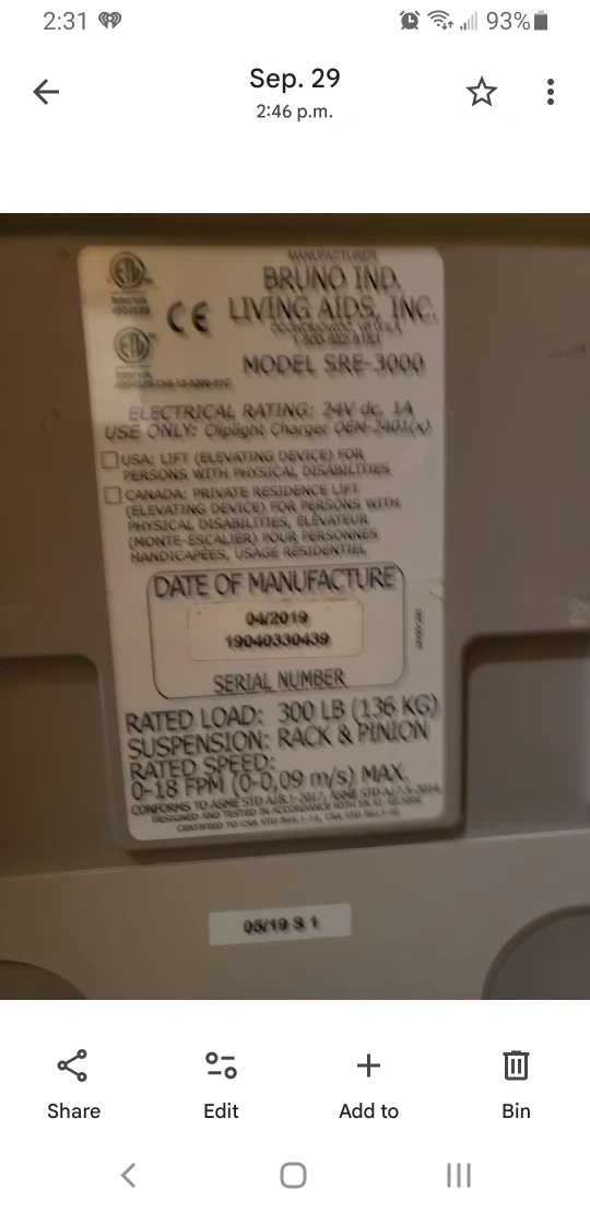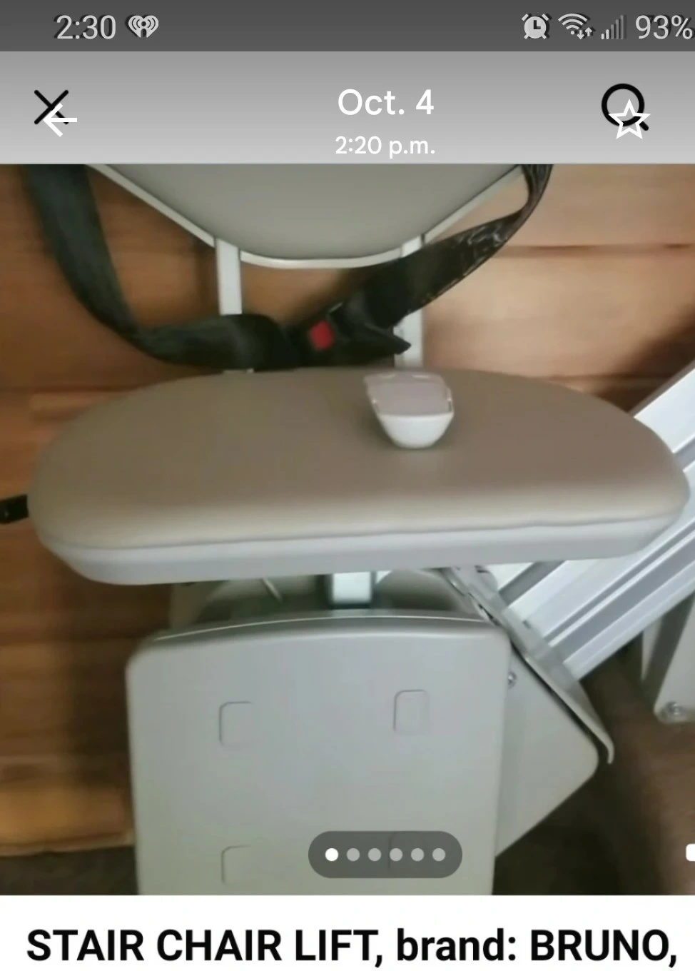 Selling a Bruno SRE-3000 stair chair lift. Manufacturing Date: 2019 April 04 Rated Load: 300 lb (136 kg) Suspension: Rack & Pinion is only a few years old and have it for 2 flights of stairs. is still connected to my stairs so u would have to dismantle it but still in good shape. if interested make me an offer and I guarantee u will be getting it for an insanely good deal