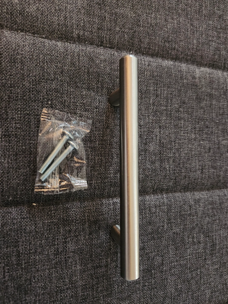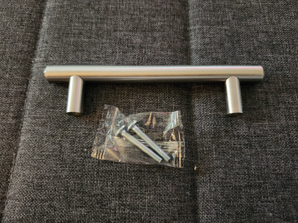 Selling a brushed nickel cabinet pull handle. It comes with the screws in the original packaging. Perfect for updating your kitchen or bathroom cabinets! 26 of them. I just changed my decor. Heavy metal. Great quality.
