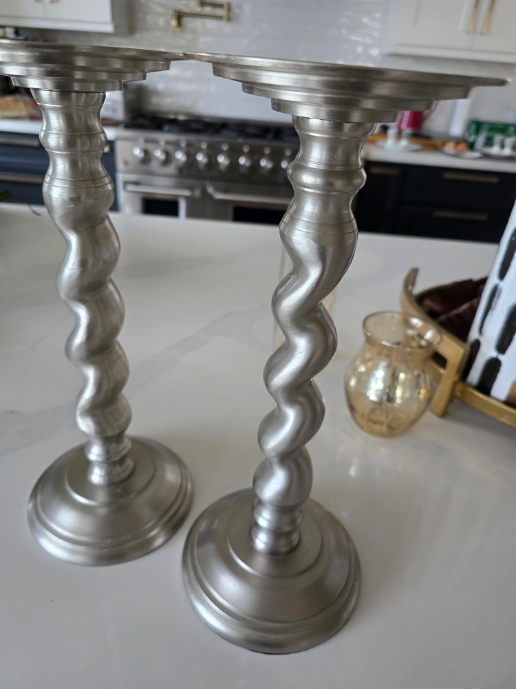 Set of two brushed silver candle holders with a twisted design. Great for any home décor. 13" tall. Will hold a variety of column/pillar candles 5" diameter