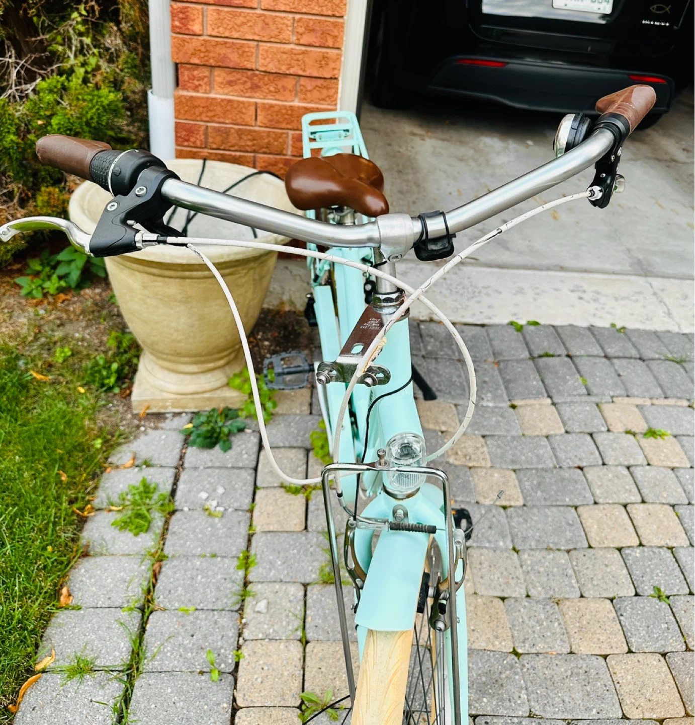 Selling a Decathlon BTWIN city bike in a lovely mint green colour! It's perfect for leisurely rides around town or commuting. The bike is in great condition and ready for a new owner to enjoy. It has a bell which works. It also has bike reflectors which make it safe for riding at night. It has a comfortable brown seat and handy rack on the back. Feel free to message me with any questions!